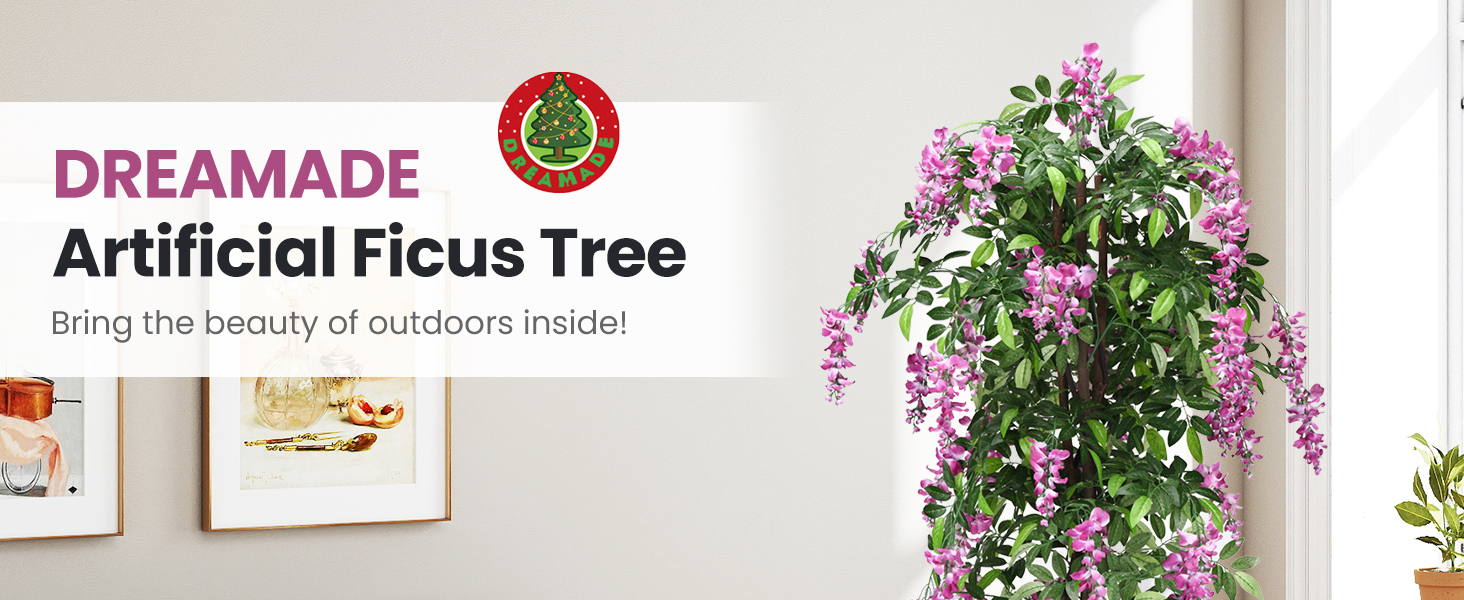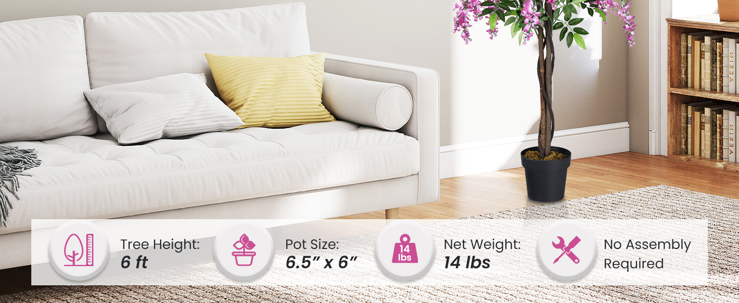 [Ultra-Realistic 6ft Artificial Wisteria Tree with 1260 Blooms]: 2 natural-textured wood trunks support 1260 delicately crafted polyester leaves and flowers, meticulously arranged to mirror the cascading beauty of a living wisteria tree. Perfect for adding botanical elegance to modern or traditional interiors.