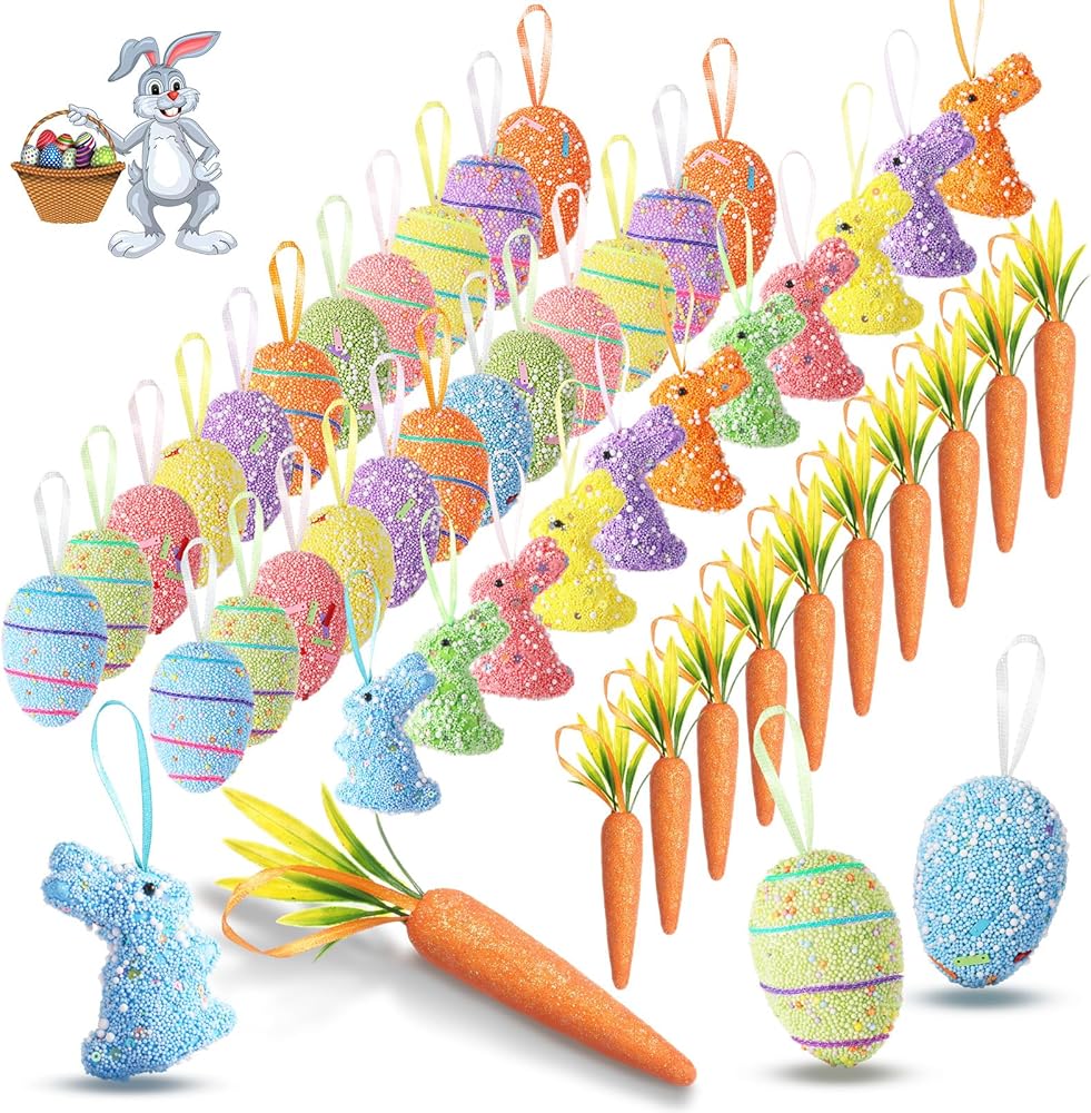Brighten your home or office with these colorful Easter ornaments for tree. The mix of Easter eggs, bunnies, and carrots decorates tables, shelves, or baskets, creating a lively spring atmosphere.