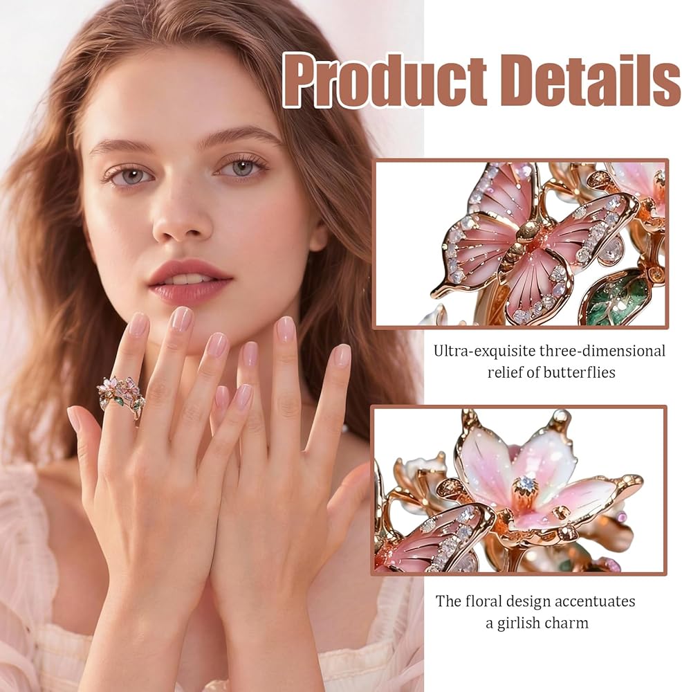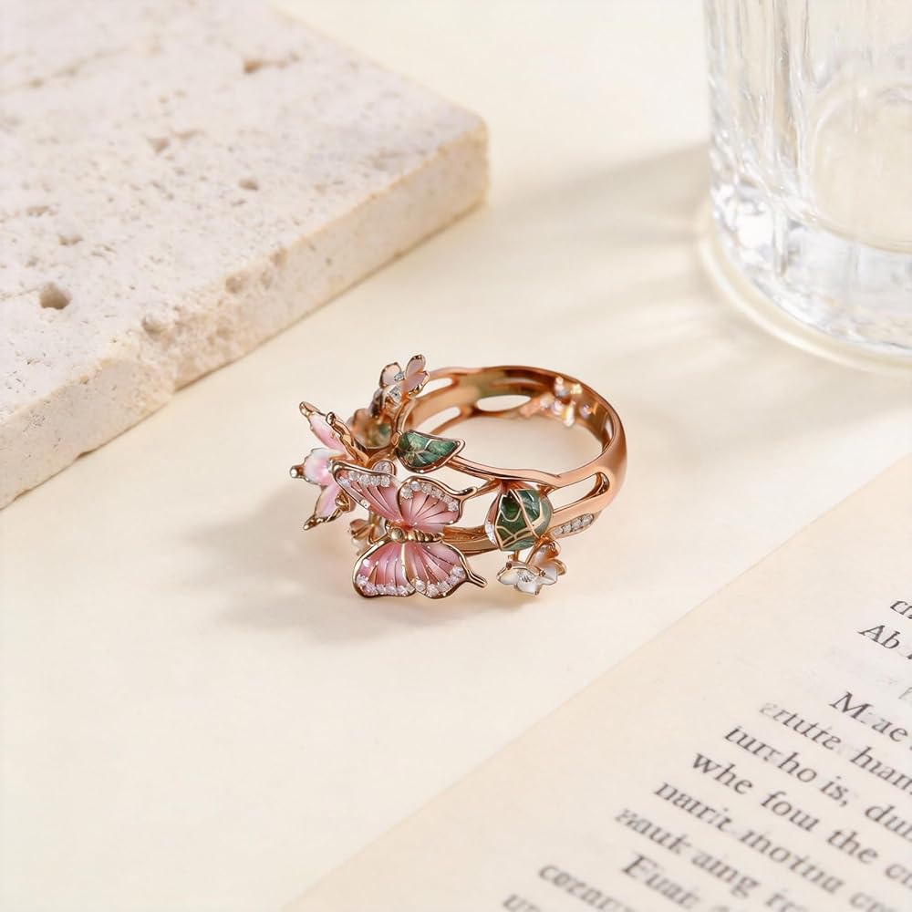 ROMANTIC GARDEN AESTHETIC – Inspired by nature's beauty, this exquisite ring features pink butterfly dancing among blooming flowers and green leaves, that adds a touch of elegance to any outfit