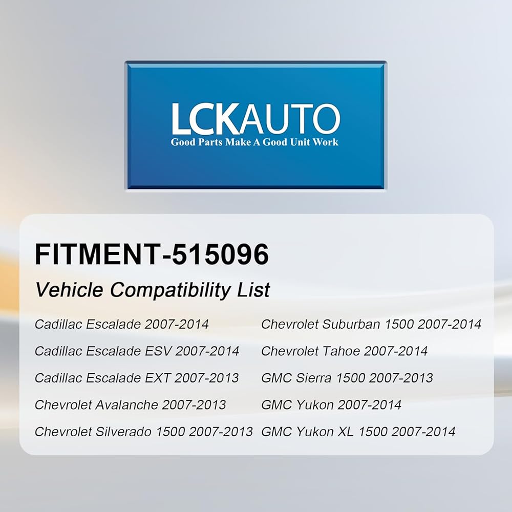 Compatibility Vehicle: 515096 Wheel Hub Assembly compatible with 07-14 Cadillac Escalade/07-14 Escalade ESV/07-13 Escalade EXT, 07-13 Chevy Avalanche/07-13 Silverado 1500/07-14 Suburban 1500/07-14 Tahoe, 07-13 GMC Sierra 1500/07-14 Yukon/07-14 Yukon XL 1500. For more detailed model application information, please check the detail page.
