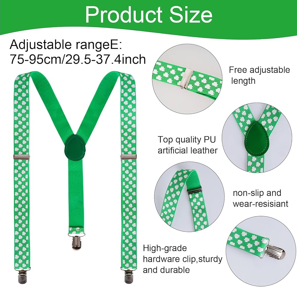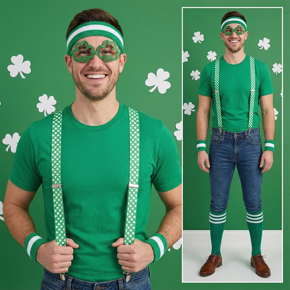 Complete 7-Piece Irish Costume Accessories Set:This comprehensive St. Patrick's Day costume set includes shamrock sunglasses 5.9in, a headband 7.9x2.2in, wrist sweatbands 3.2x3.2in, high tube socks 14.6in, and adjustable elastic suspenders 29.5-37.4in. The matching Shamrocks Belt Bag accessories work together as a complete outfit.