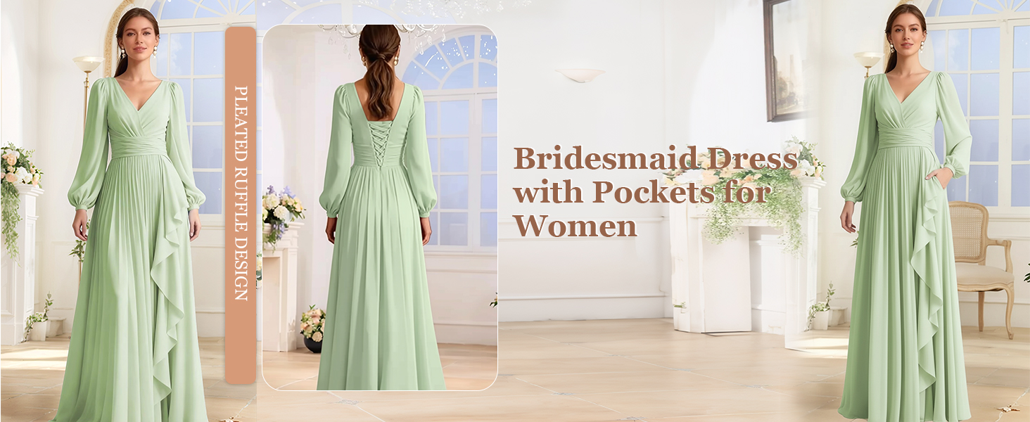 Airy & Romantic: long bridesmaid dresses-crafted from soft, flowing chiffon fabric that moves with grace, these dresses feature a flattering A-line silhouette and delicate ruffle accents that add texture and femininity—creating a dreamy, comfortable look perfect for wedding celebrations
