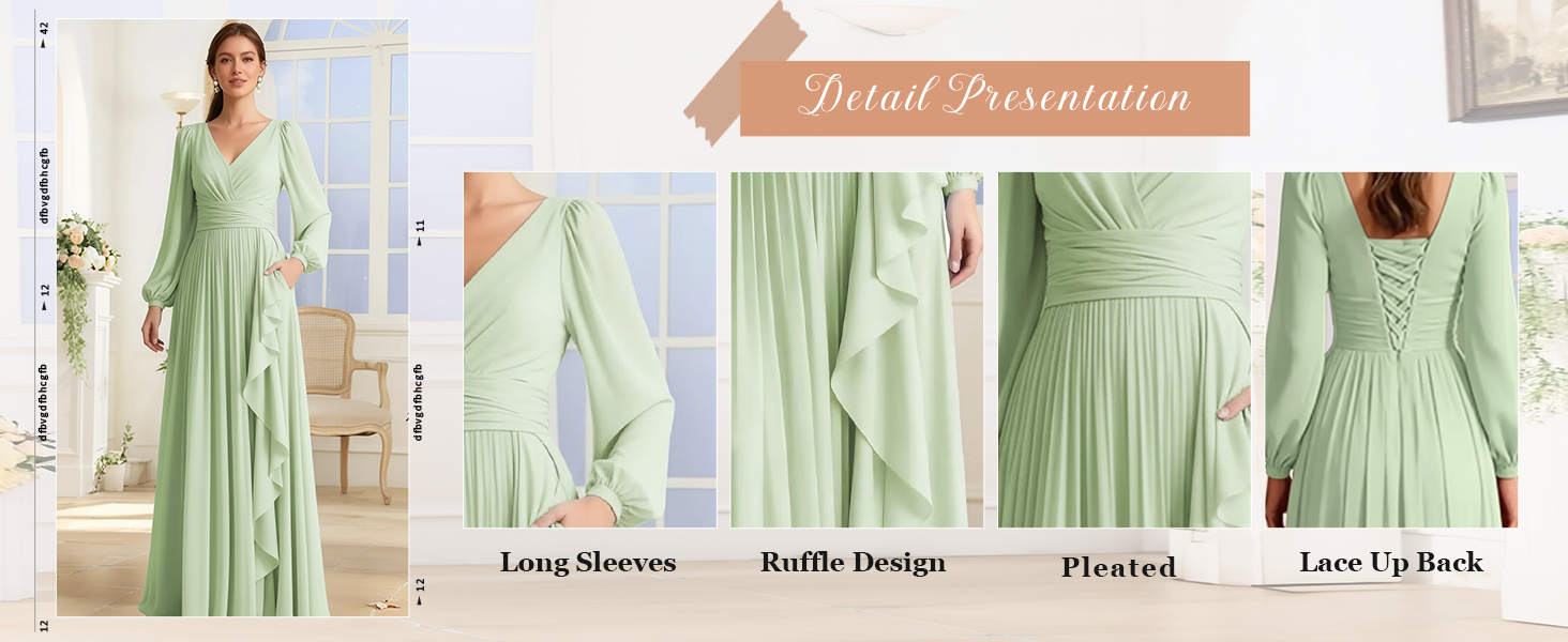 Features: v neck, chiffon fabric, pleated, long sleeves, ruffle, lace up back, a line, maxi, padded, with lining, bridesmaid dresses, wedding guest dresses, formal evening dresses, wedding party dresses, mother of the bride dresses, mother of the groom dresses, wedding dress