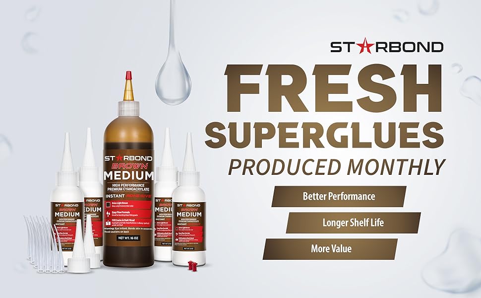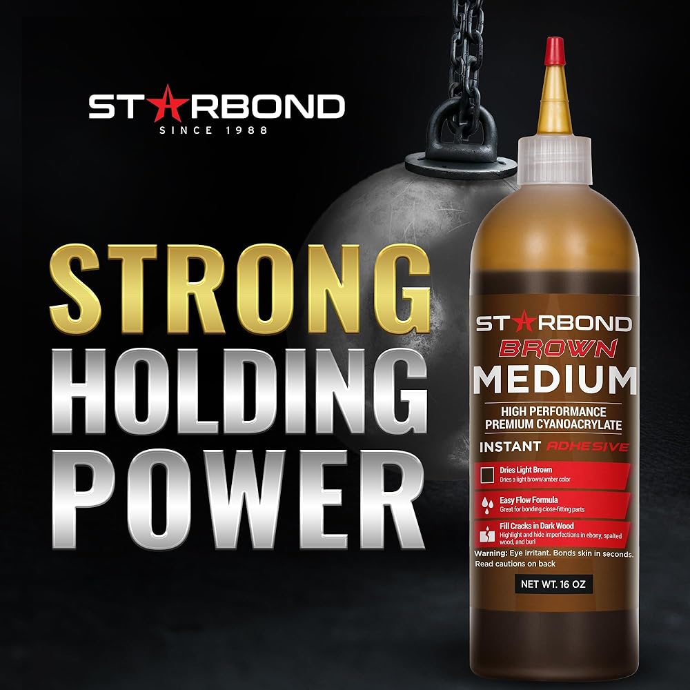 Premium Grade Cyanoacrylate (CA) Super Glue by STARBOND - 16 OZ Complete Refill KIT (453-gram) - Light Brown Medium Crack Filler 150 CPS Viscosity Adhesive for Woodworking, Woodturning, Carpentry