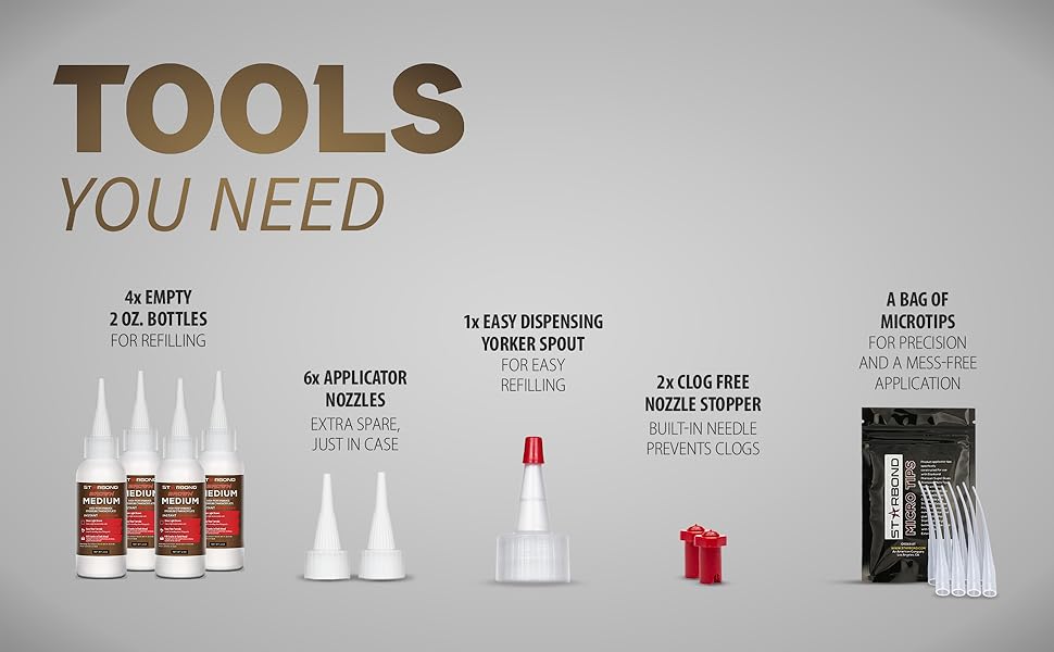 ✅ EXTRA SUPPLIES: 1-yorker spout, 4-empty bottles, 6-applicator caps, 2-clog-free stopper, bag of micro-tips. The YORKER SPOUT allows easy refilling of EXTRA BOTTLES. The EXTRA APPLICATOR CAPS are in case of future clogs, you're prepared which means you'll never have to stop working! Keep your glue working perfectly with CLOG FREE STOPPER that prevents any clogs for smooth application. BAG OF MICRO-TIPS provides perfect extension for those hard-to-reach places. Precision is key for tiny cracks