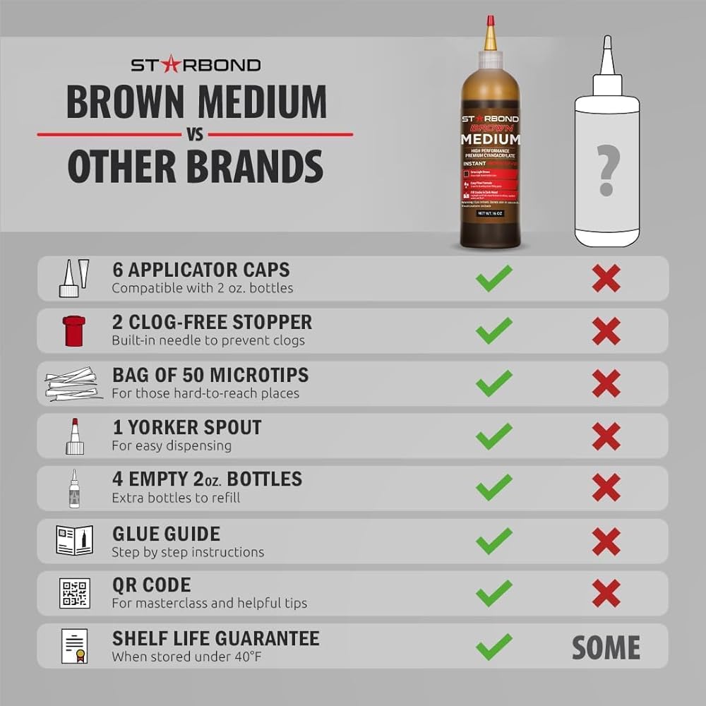✅ PREMIUM CYANOACRYLATE SUPER GLUE - LAB TESTED FOR OPTIMAL PERFORMANCE: High performance industrial grade adhesive. This Medium Brown CA dries light amber in color, eliminating the need to use sawdust with CA glue.