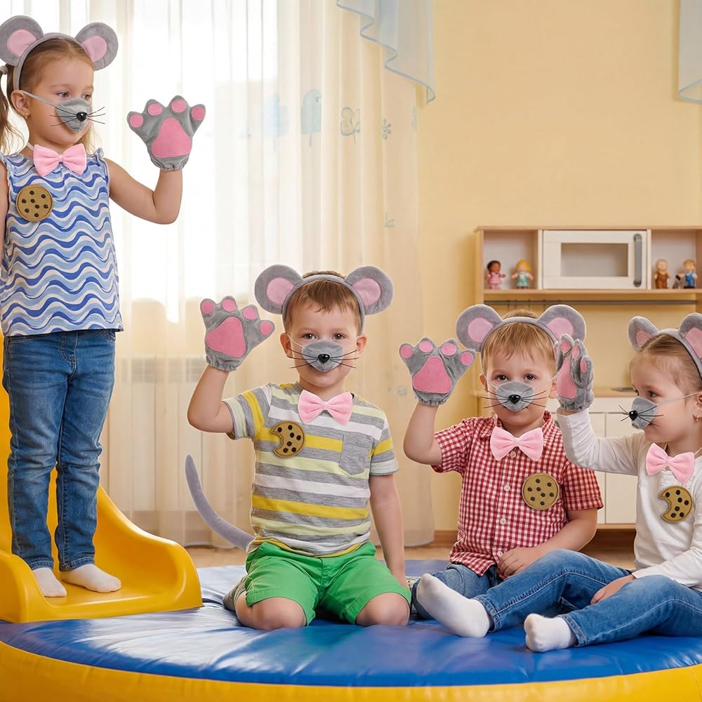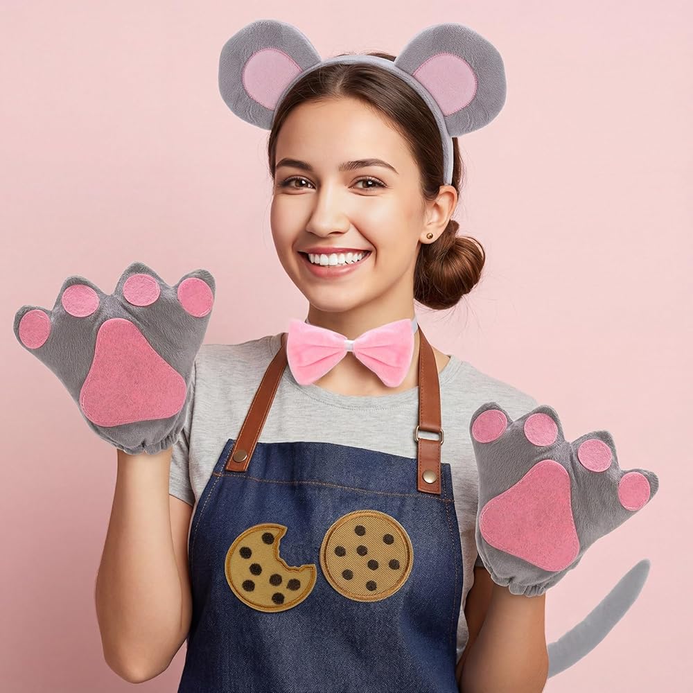 Package Includes: Includes 1 mouse headband, 1 bowtie, 1 mouse tail, 1 mouse nose, 1 pair of mouse gloves, 1 double-sided adhesive sticker, and 10 cookie props. No need to buy separate pieces; it builds a full, playful look quickly.