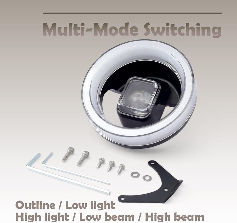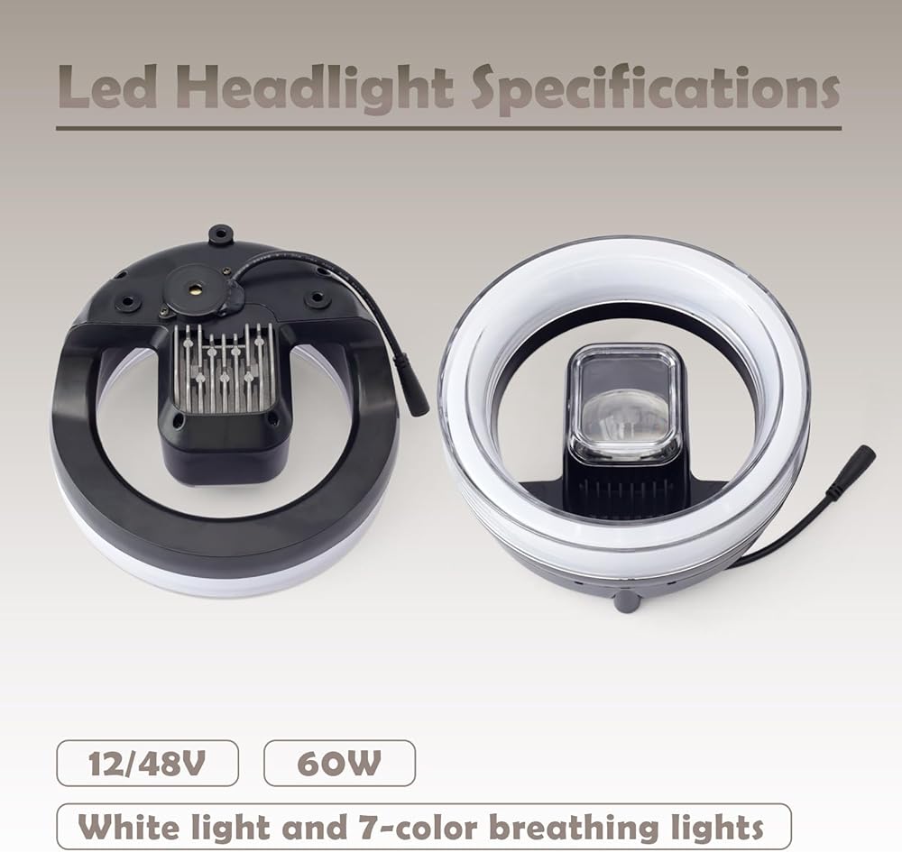 Product Specifications: 12/48V, 60W, outline/low light/high light, low beam/high beam, white light and 7-color breathing lights. Comprehensive functions for a comfortable riding experience