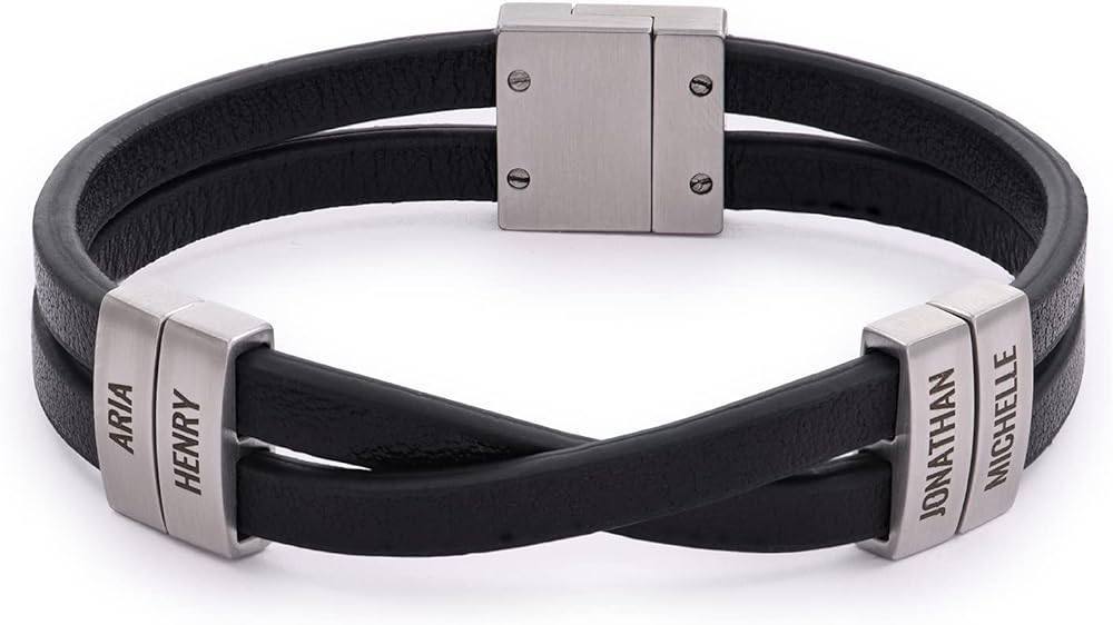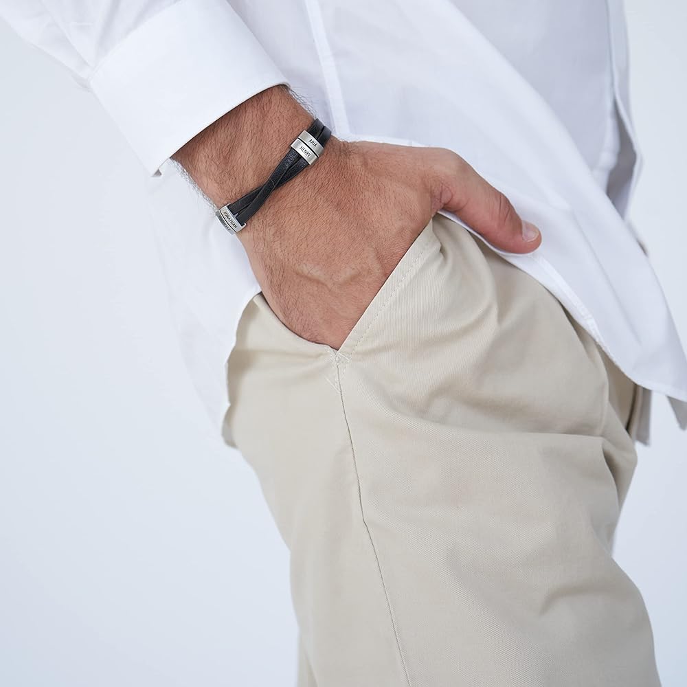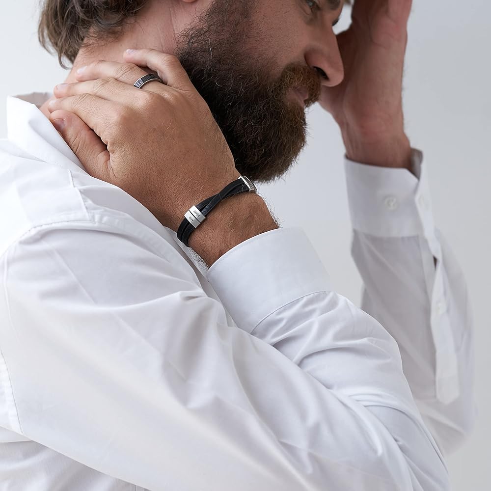 MYKA - Personalized Criss-Cross Men Leather Bracelet with Up to 4 Inscriptions - Stainless Steel - Dainty Gift for Him, Father, Boyfriend for Father's Day, Birthday