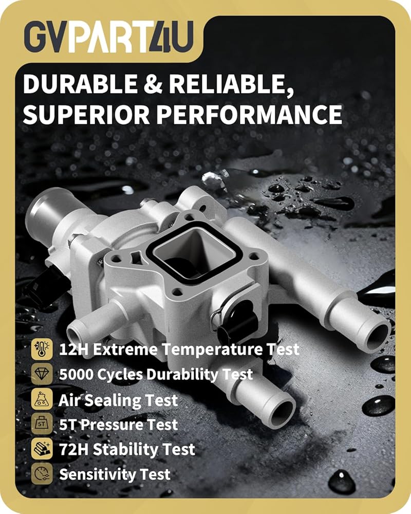 [5000 Extreme Temperature Test] GVPART4U engine coolant thermostat housing assembly opening temperature is precisely set at 221°F. It remains stable&reliable, and able to open accurately even after 5,000 full opening and closing cycles under extreme temperatures ranging from -40°F to 275°F, its temperature control accuracy far exceeds that of ordinary models