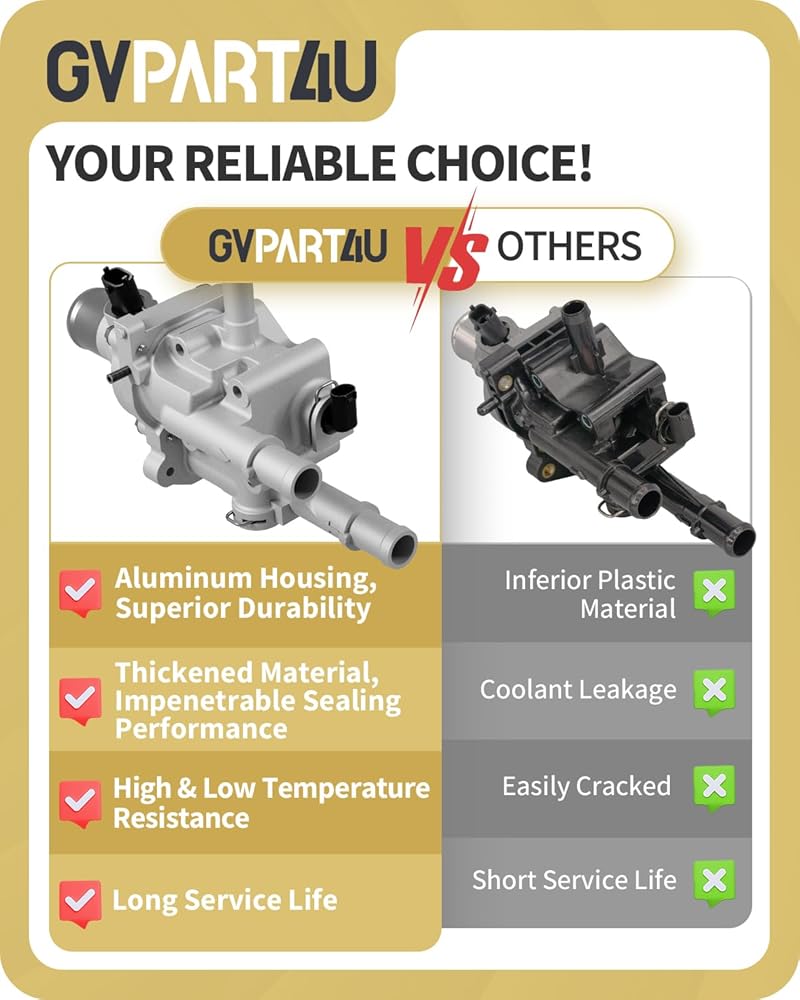 [Material Upgrade] GVPART4U coolant thermostat housing assembly is made of high-quality precision die-cast aluminum. It withstands a rigorous 5-ton pressure test without cracking, and delivers superior wear and corrosion resistance compared to conventional plastic versions. Say goodbye to high maintenance costs and the hidden risk of engine wear