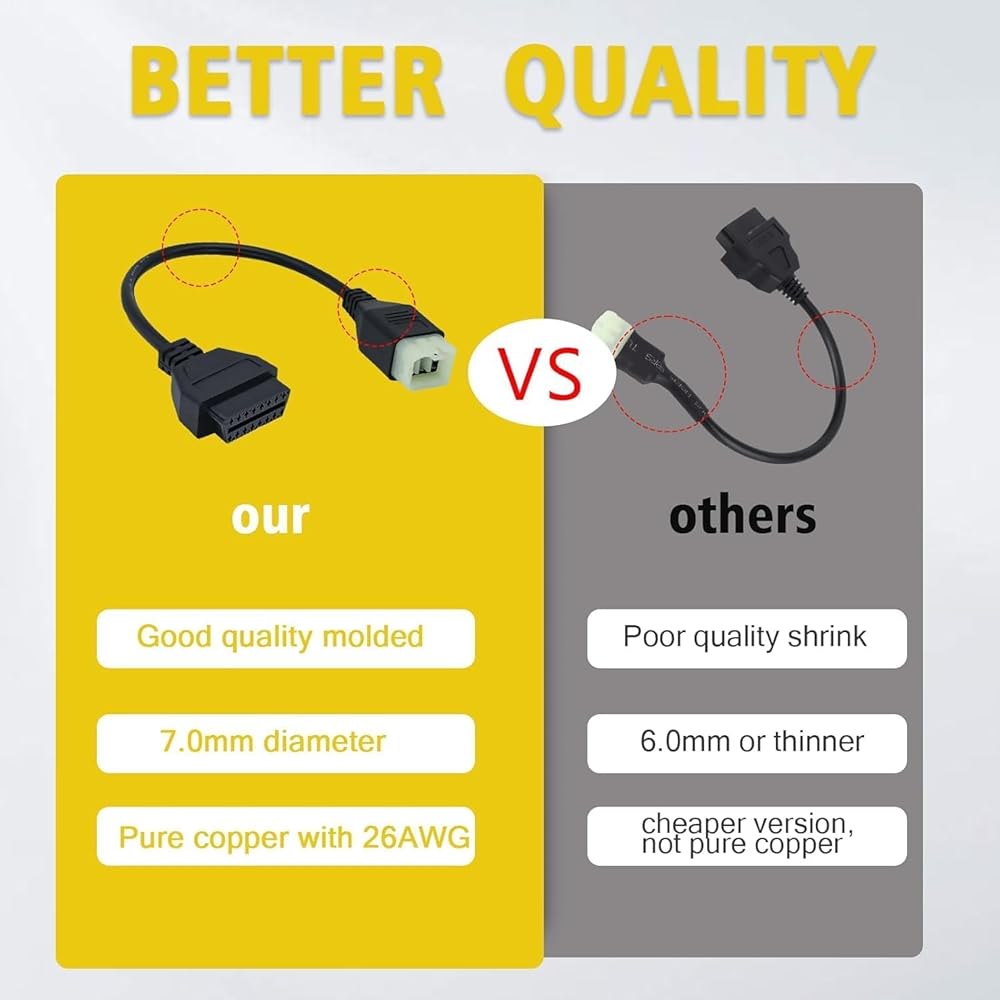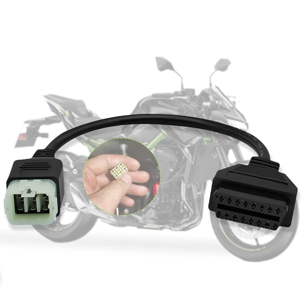 3.This OBDII 6pin moto obd2 adapter are easy to use, even for those who are not familiar with motorcycle diagnostics. OBDII 6pin motorrad cable Simply plug them in and follow the instructions. This 6pin motorbike OBD cable works with various programs / apps and with standard OBD2 readers, convert OBD2 standard 16pin connector to required for kawasaki 6pin connector.Advantages: Works seamlessly with many motorcycle diagnostic tools and OBD code readers, and is easy to operate. Just plug it in and follow the instructions.The 6-pin OBD cable is suitable for a variety of applications and is used with standard OBD2 card readers for a wide range of applications and easy application.