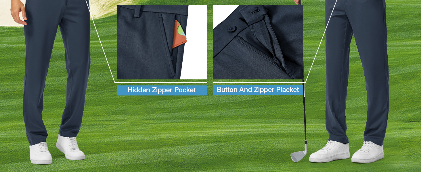 MULTI- FUNCTIONAL STRETCH FABRIC: Men's golf pants feature 4- way stretch fabric that combines breathability, quick- dry, UPF 50+, moisture- wicking, wrinkle resistance, and water repellency