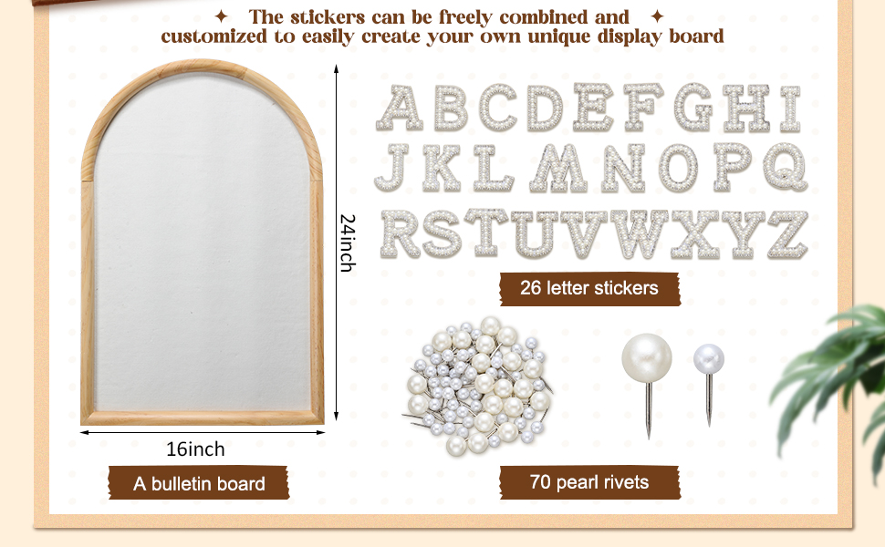 Comprehensive Accessories: this set includes one bulletin board, 70 pearl studs, and 26 letter stickers, all included in one package, no extra purchases required; The stickers can be combined DIY, making it easy to create your own vision board, wedding message board, or family photo display