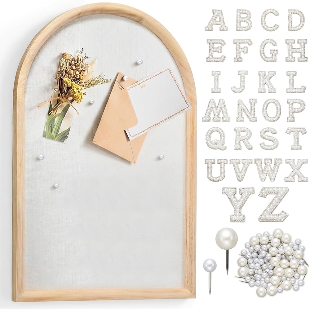 24x16 Arch Bulletin Board with Pin Linen Display Framed Decorative Hanging Wood Vision Arch Cork Board for Wedding Wall Office School Home Decor, 70 Pearl Studs, 26 Letter Stickers(Natural)