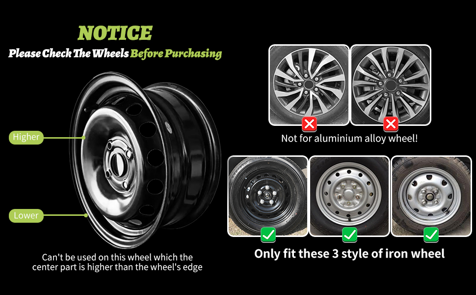 Before purchase, double - check your tire and wheel size. These hubcaps are tailored for 17- inch iron rims and won't work with aluminum alloy wheels. Using them on the wrong wheels can lead to misfit or damage. Ensure proper fit and performance by verifying your wheel specs.
