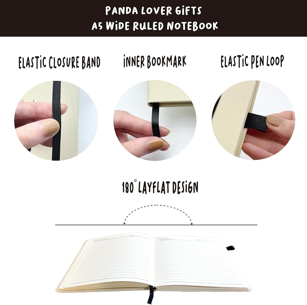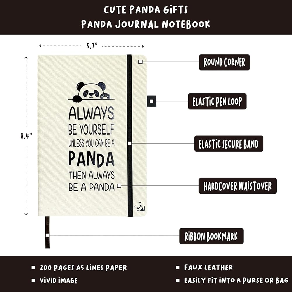 The cover of Panda journal notebook is engraved with inspirational quotes, and is made of sturdy PU leather and wide ruled paper. The size of Panda notebook measures 8.4”x 5.7” with an inner ribbon bookmark, pen loop and elastic closure band secures the notebook