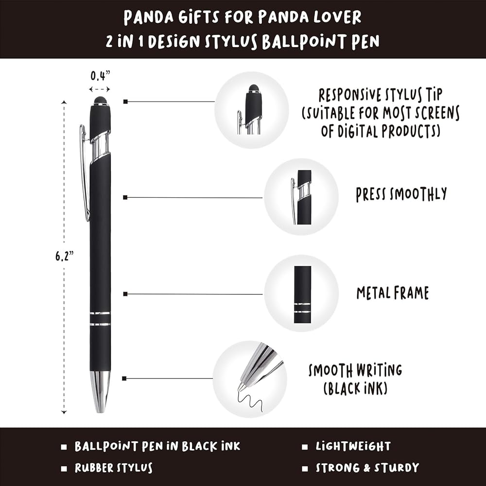 Panda novelty gifts also includes a 2 in 1 design stylus ballpoint pen, the rubber stylus tip allows you to use smoothly on most screens of digital products, responsive as finger touch but keeps touch screen from scratches, fingerprints or grease. The pen adopts a 1 mm black ink and dry quickly, does not stain documents or books