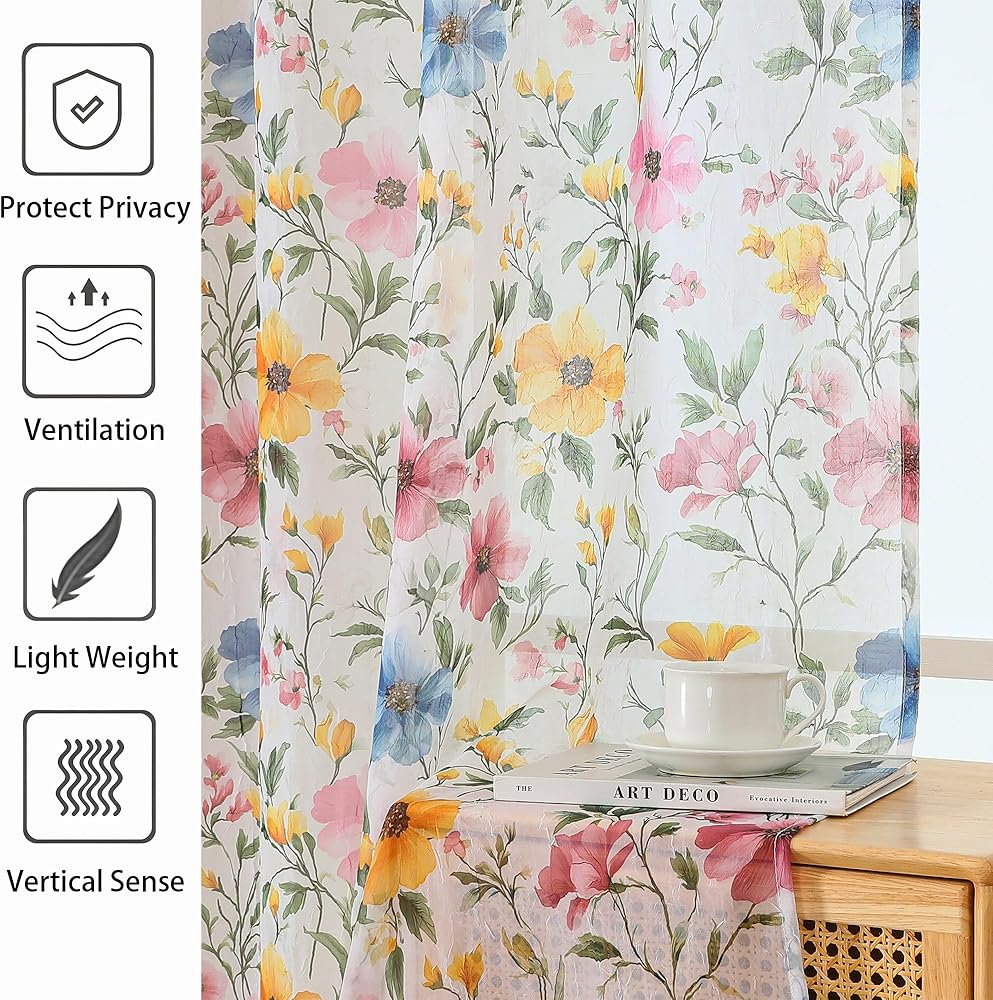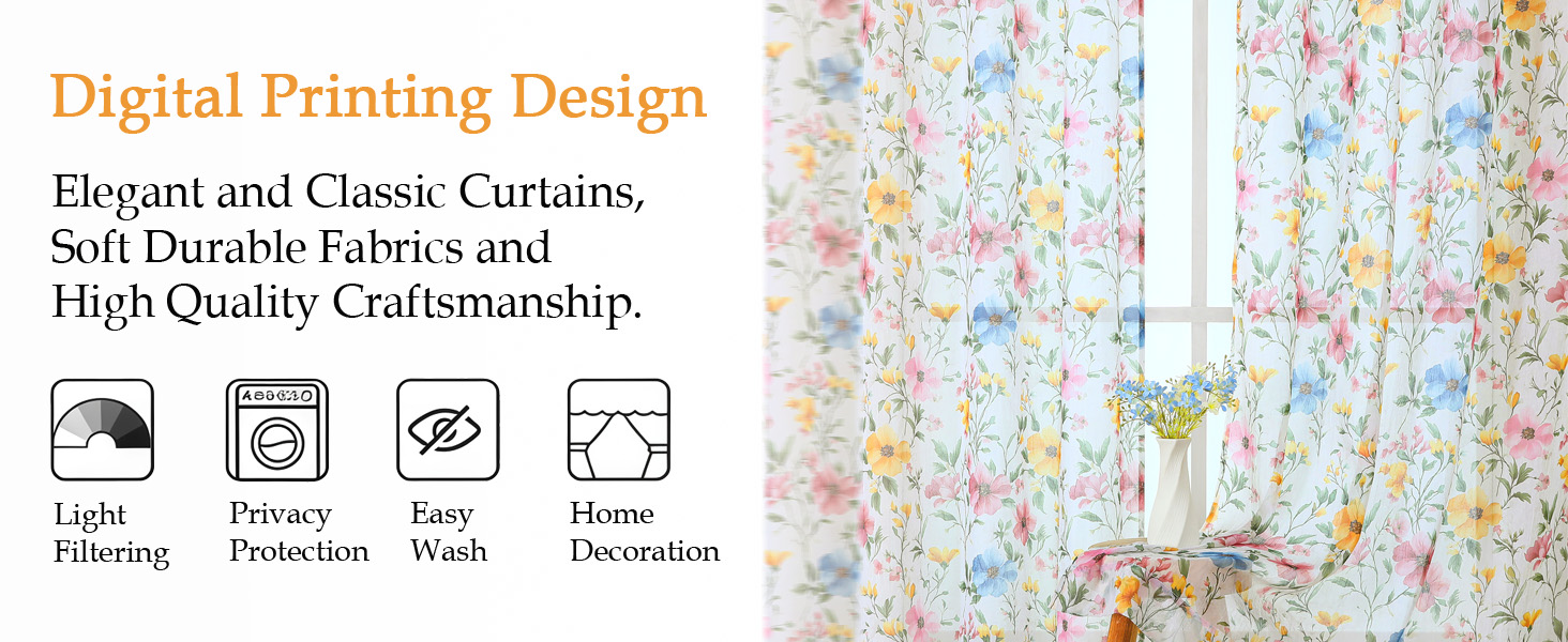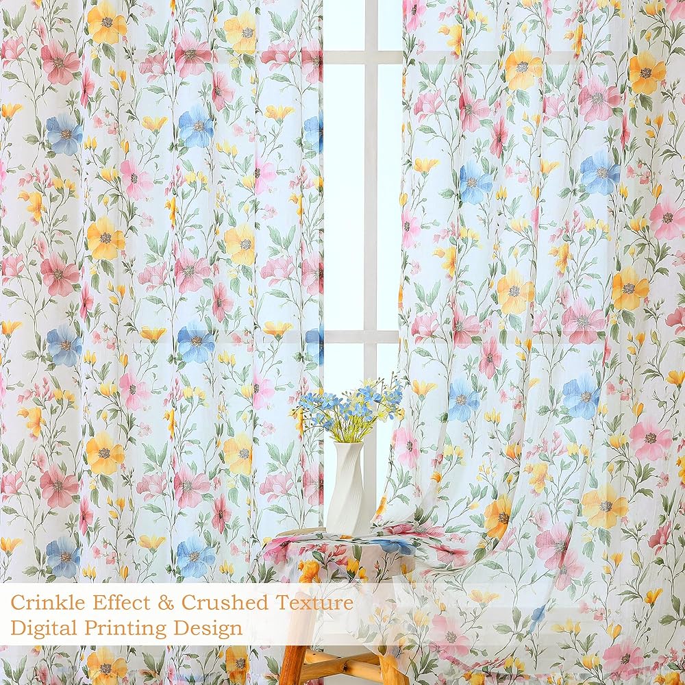 Light-Filtering Crushed Sheer Fabric: This Floral sheer curtains are crafted from 100% polyester crinkled fabric, featuring a smooth texture and stylish look. Hang them in your favorite space to decorate your windows and enhance the casual atmosphere of your home. They softly diffuse natural light while maintaining privacy