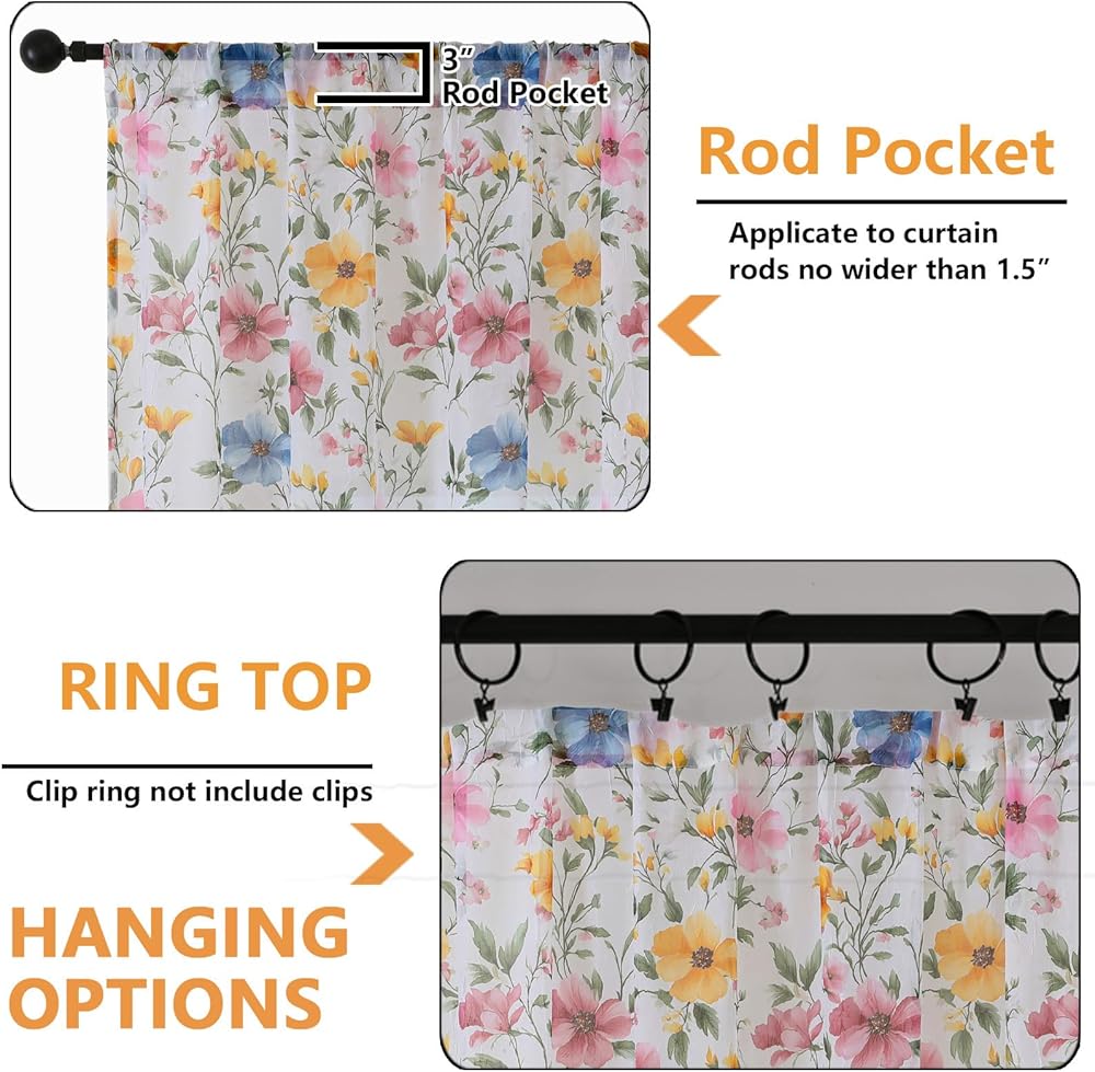 Vibrant Floral Printed Design: Featuring a vibrant watercolor floral print (exclusive to Lisa and Laura Studio). The soft, artistic pattern blends pink, sky blue, and sunny yellow, along with warm orange blossoms, are scattered across an white sheer base, infusing your room with a fresh, garden-inspired charm and a touch of romantic natural beauty, perfect for spring and summer decor
