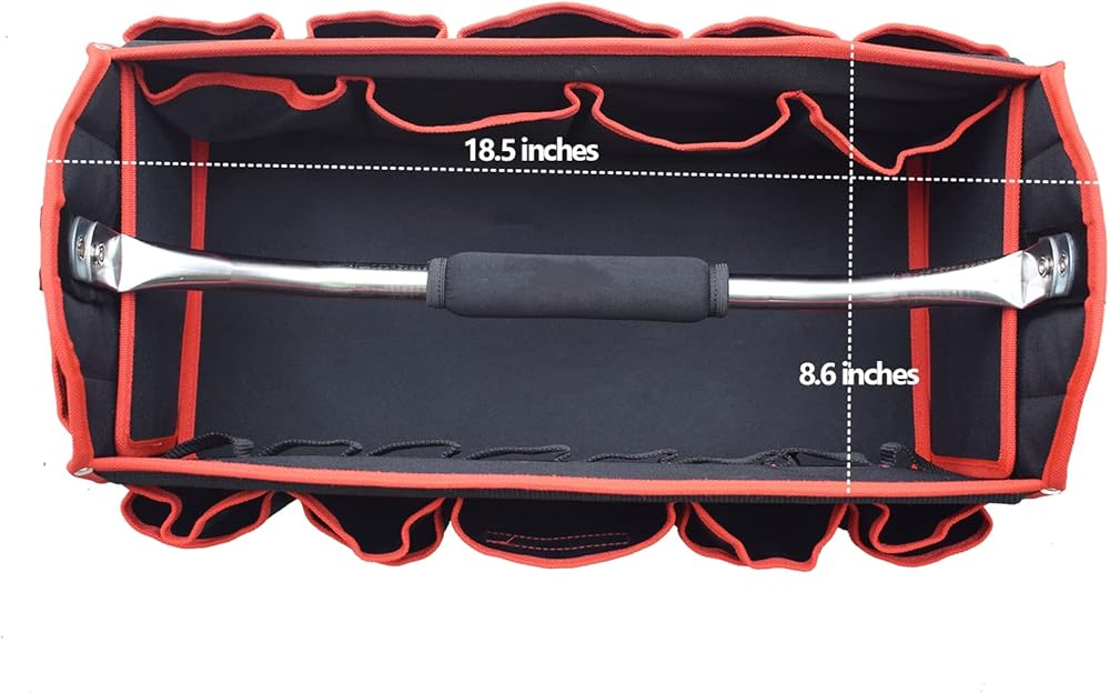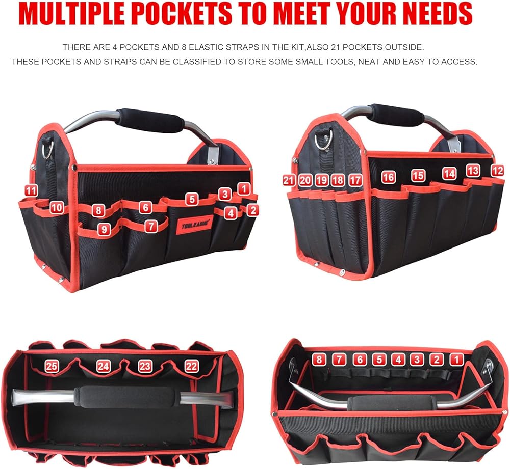 【25 Pockets & Large Capacity】:There are 4 pockets in the kit and 21 pockets outside. These pockets can be classified to store some small tools, neat and easy to access, 19-inch capacity can meet most of the daily tools storage.s, 14-inch capacity can meet most of the daily tools storage.