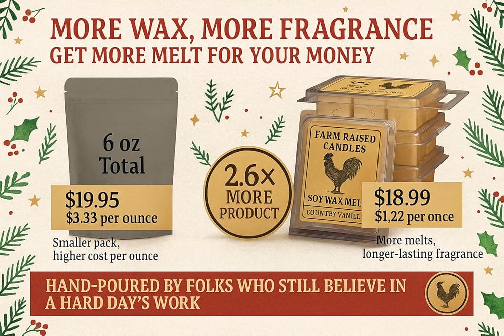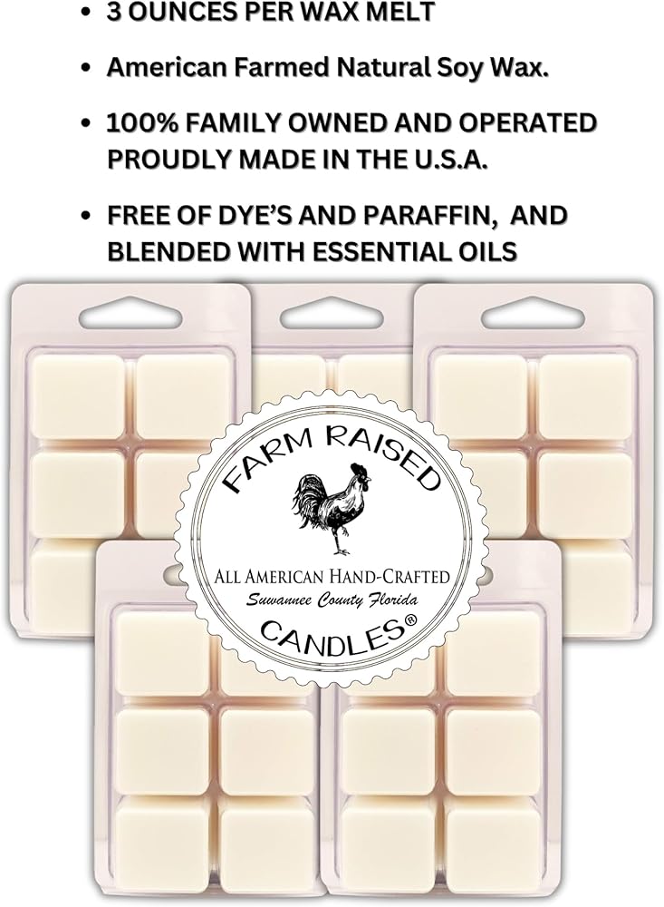 🎄 Hand-Poured Soy Wax Melts Unlike mass-produced paraffin, Farm Raised Candles wax melts are hand-poured in small batches with 100% American-farmed soy wax. Each cube melts evenly and cleanly in any wax warmer, filling your home with authentic holiday comfort.