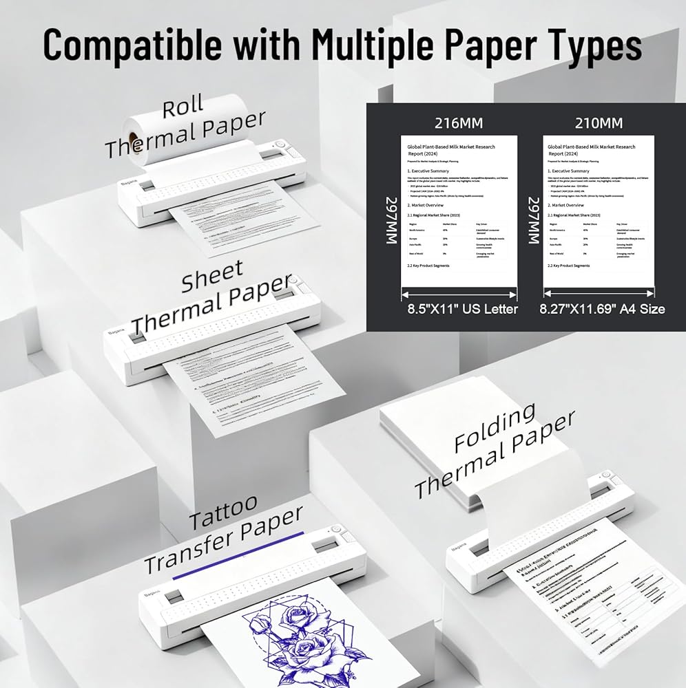 【Smart App & Effortless Workflow】Simplify printing with the intuitive dedicated app. This portable printer for iPhone and Android allows you to import, adjust, and print documents (Word, Excel, PDF, images) or tattoo stencils with one tap. The streamlined workflow makes this portable thermal printer 8.5 x 11 accessible for everyone.