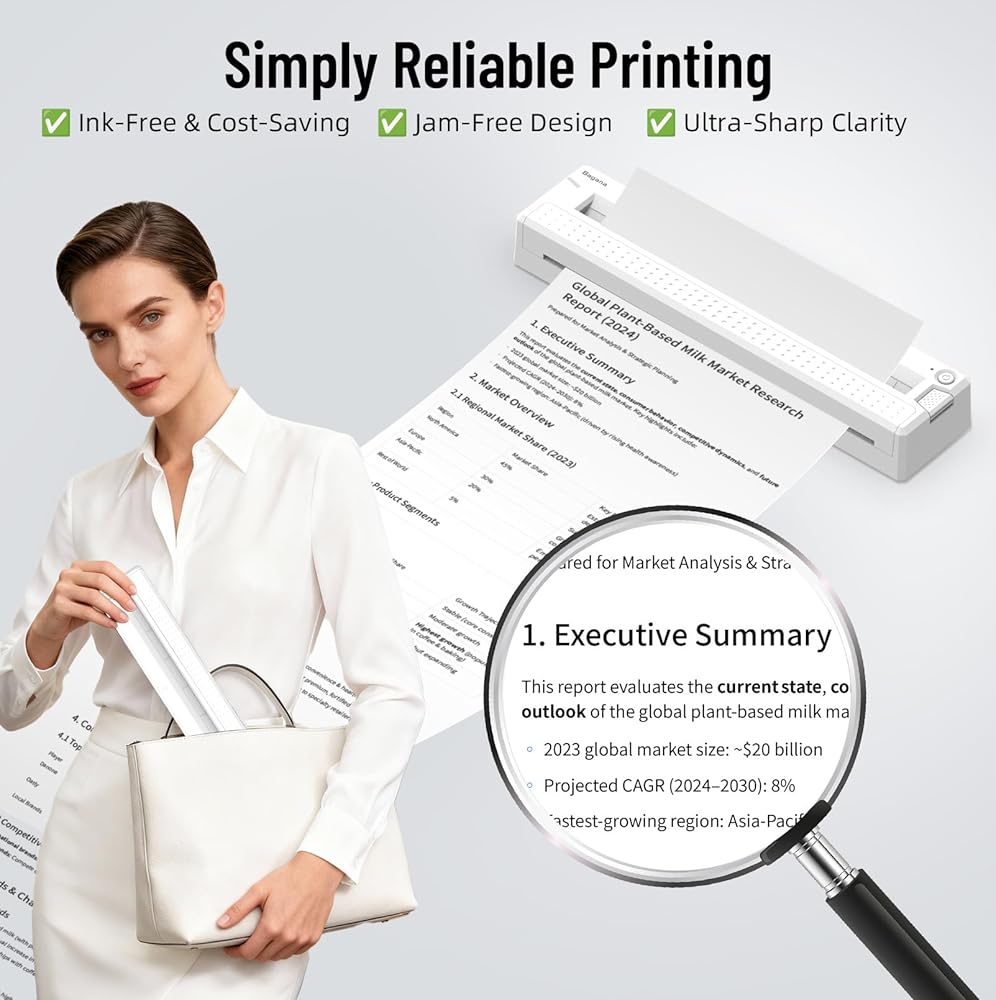 【Ultra Portable Thermal Printer】Weighing only 1 pound with a compact design, this small wireless printer fits effortlessly into any bag. It's your perfect on-the-go companion, delivering reliable printing for work, studies, or travel—anytime, anywhere.