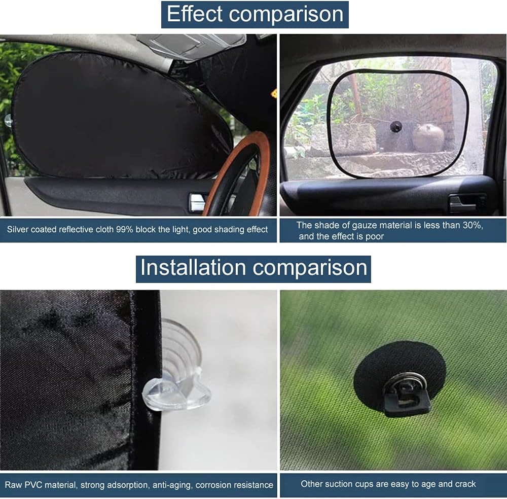 【Easy to install】The front window can be easily fixed by opening the two sunshades of the front seat, pressing the sunshade, and then closing the two sunshades. The other windows can be fixed on the sunshade with only two sucti