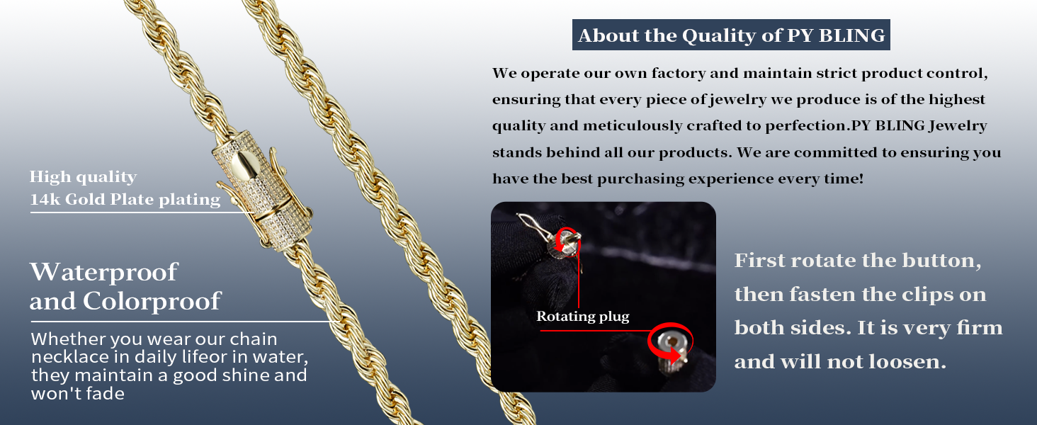 【Durable and comfortable】This gold rope chain is well-made, and the tight twist pattern enhances durability. Each link is perfectly polished for a silky skin touch. The sturdy structure is durable and is a long-lasting investment choice that you deserve to wear again and again.