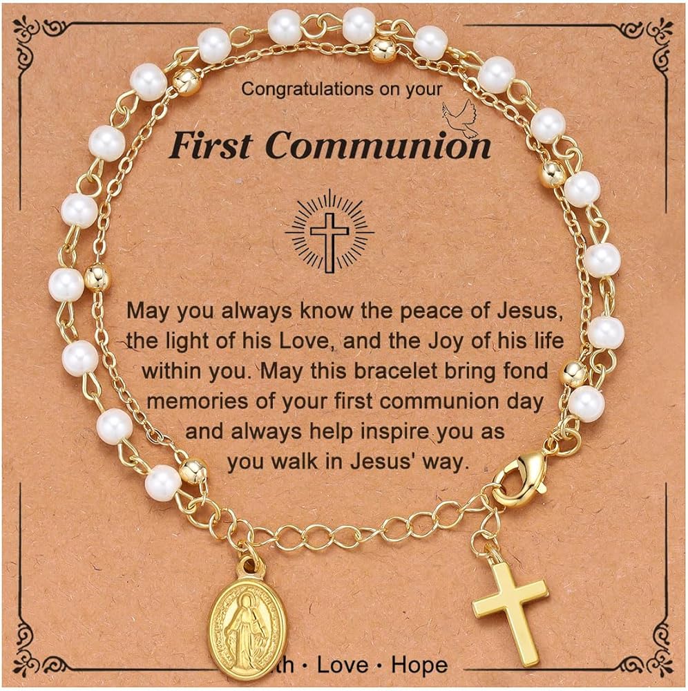 First Communion Gifts for Daughter : This delicate beaded bracelet features a catholic miraculous medal of the virgin mary and a polished cross pendant. It has a unique rosary chain and extender chain design, exuding beauty and elegance! The virgin mary represents divine guidance and motherly love. The cross symbolizes firm devotion to Christ, and the pearls symbolize the purity of the soul during the first communion