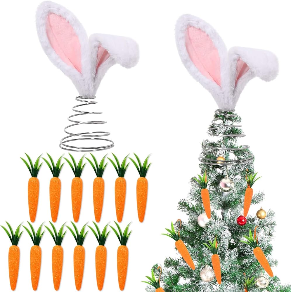 Suitable Size: The white bunny ear tree topper measures 11 x 3.74 inches (28 x 9.5 cm), and each carrot ornament measures 5.12 x 0.94 inches (13 x 2.4 cm), making them compatible with most small Christmas trees and desktop plant decorations.