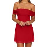 Trendy Off-Shoulder Mesh Mini Dress:This off-shoulder mini dress features a clean straight neckline that perfectly shows off your shoulders and collarbone. The sheer double-layer mesh creates a flirty yet elegant look, making this dress a must-have for going out.