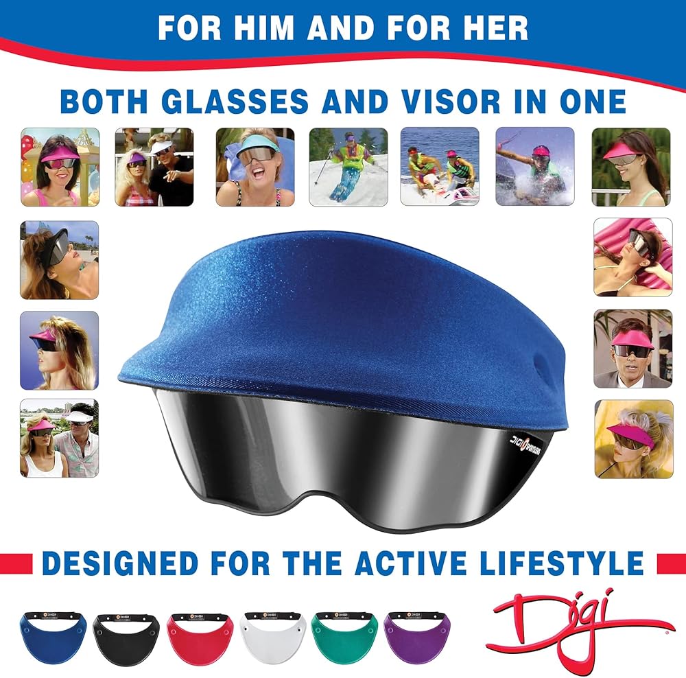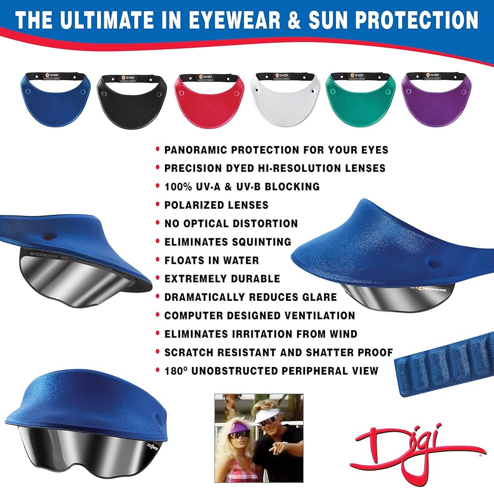 Digi Sportlens provides superior protection from the sun for men and women and can be used for a wide variety of outdoor sports and leisure activities. The full eye shield Sportlens reflects and absorbs a large portion of the visible light spectrum, making it ideal for outdoor activities where the glare from the sun can interfere with an active outdoor lifestyle, especially in snow or on the water. These men's and women's floating sunglasses are perfect for outdoor activities in all four seasons, including at the beach, on the boat, tennis, golf, fishing, running, hiking, biking, skiing, snowboarding, cycling, driving, and more. Digi Sport Lens for men and women offers 2-in-1 sun protection for your eyes: Polarized wraparound sunglasses attached to a lightweight visor provide panoramic UV eye protection and wide 180 degree unobstructed peripheral vision. Scratch resistant and shatterproof, the three-layer high resolution sun glass lens is precision dyed to offer 100% UVA and UVB protection and true color vision, with a large, flexible, aerodynamic design that bends and flexes to meet the contours of your face and shades eyes without optical distortion. Unisex design for men and women is Made in the USA and features a dark black, durable plastic frame and oversized wrap around lens that fit comfortably over prescription glasses, offer dry eye relief for contact lens wearers, dramatically cuts glare, and eliminates squinting and irritation from wind and flying debris. Soft Lycra and Neoprene visors feature computer engineered vents that allow for air flow and prevent glass fogging while the ergonomic design and adjustable Velcro tabs provide a comfortable, secure fit. Mens and womens original patented Sport Lens floating eyewear exceeds the ANSI Z80.3-1986 sunglass safety standard.