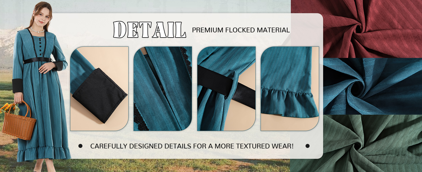 【Material】This victorian era dress is made of flocked material, which feels soft and very comfortable to wear. Machine washable, hang dry. Back zipper for easy on and off
