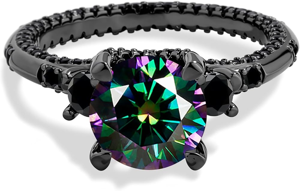 Exquisite Design: This elegant 925 sterling silver black ring features a peacock blue moissanite as the centerpiece, set in a floating four-prong setting. Smaller black cubic zirconia stones are set on both sides of the main stone and around the ring's band, adding extra sparkle and modern appeal, creating a classic and refined look