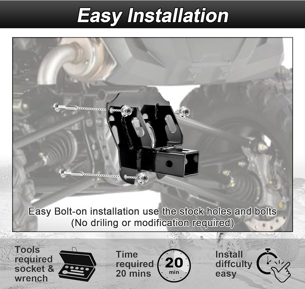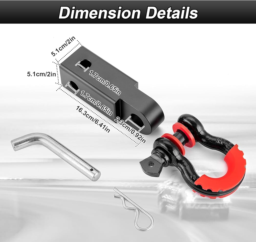 Package Includes:1 x Shackle Hitch Receiver, 1 x 3/4 D-ring Shackle with shackle isolators, 1 x 7/8" Locking Pin, 1 x Rear Receiver Hitch, 1 x Installation Instructions