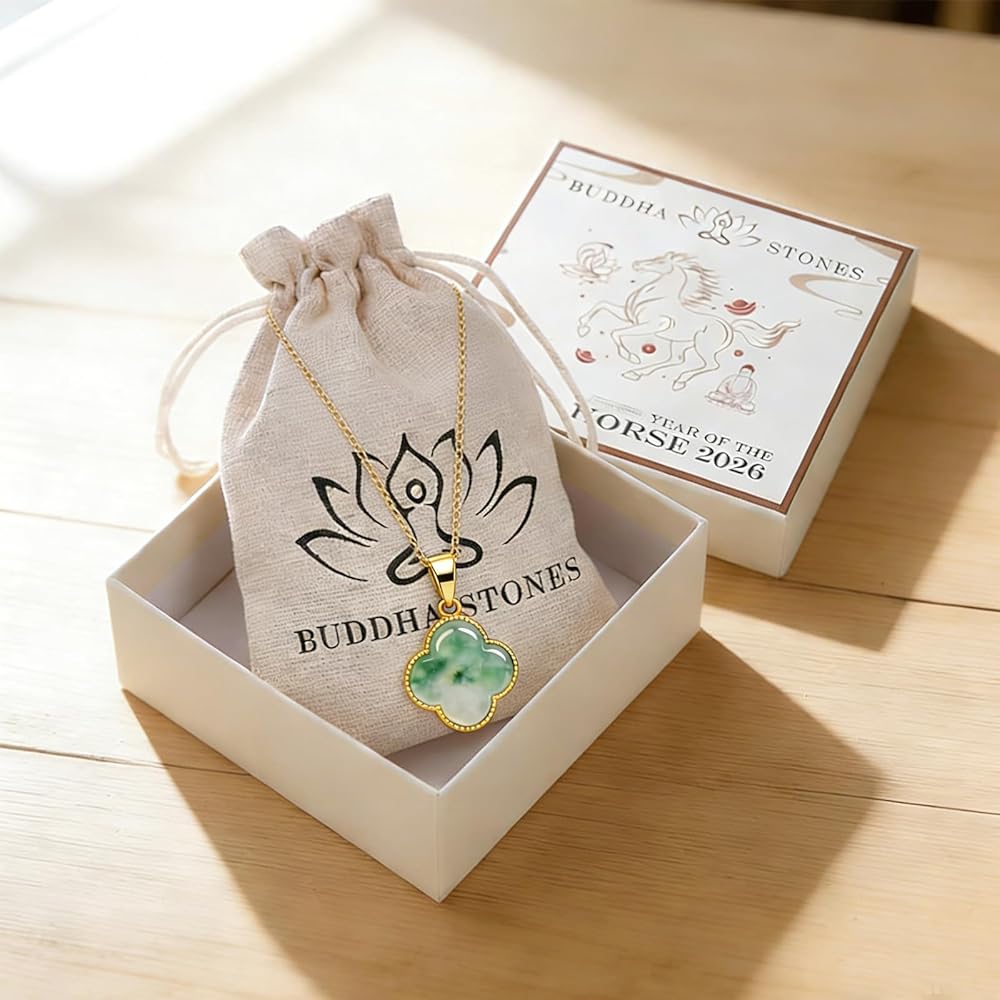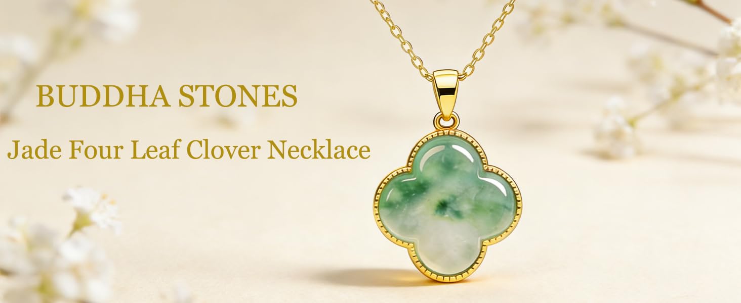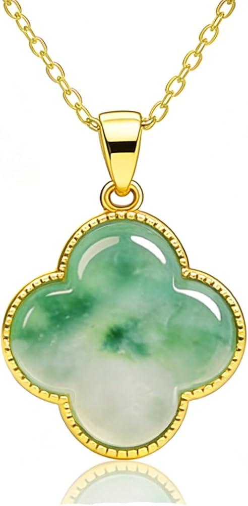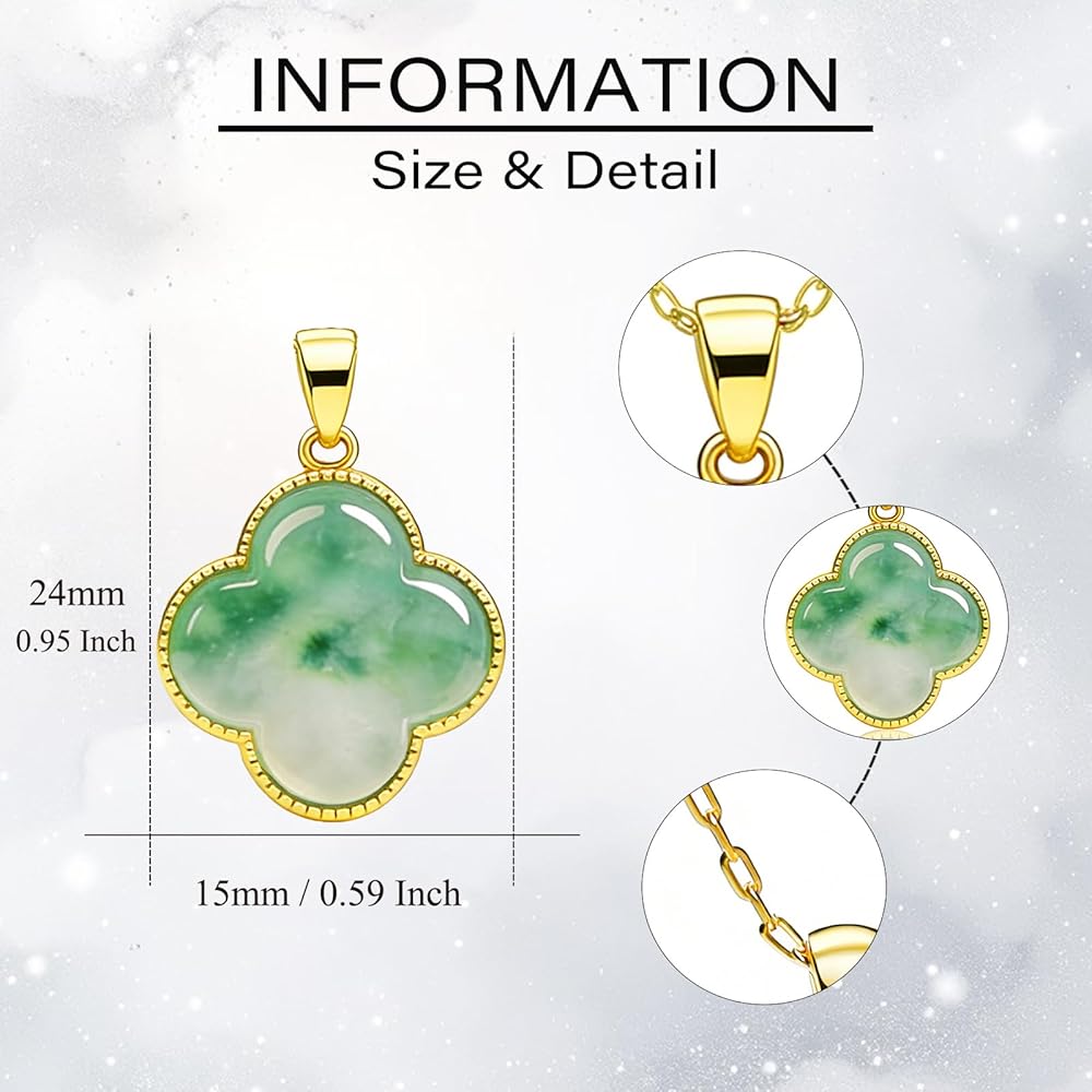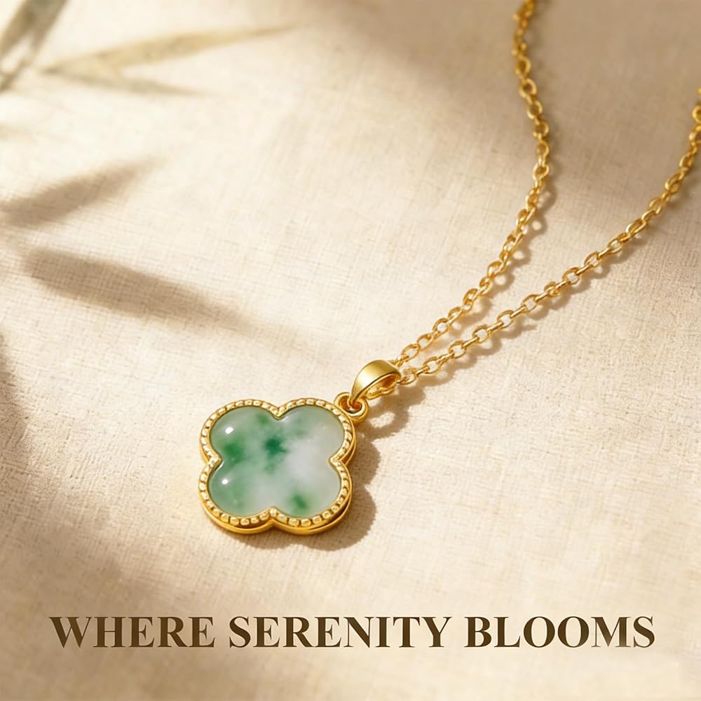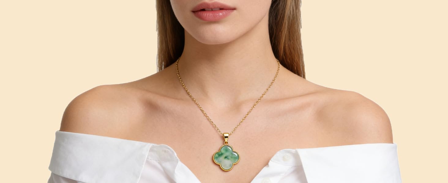 [Material] The necklace is gold plated, with a polished green jade stone at its center, set within a four leaf clover design. The exquisite electroplating process enhances the material's durability, ensuring its lasting brilliance with daily wear.