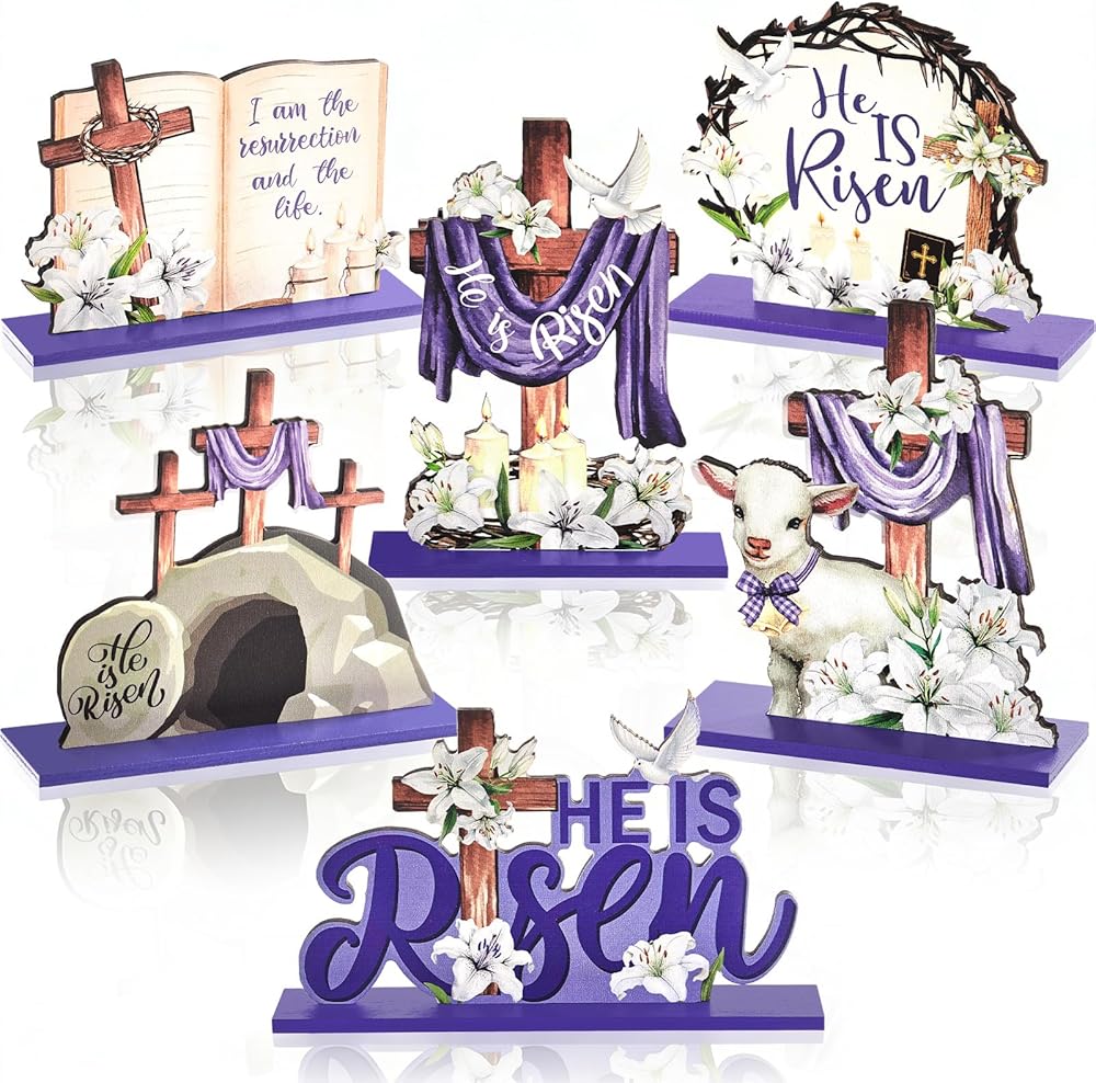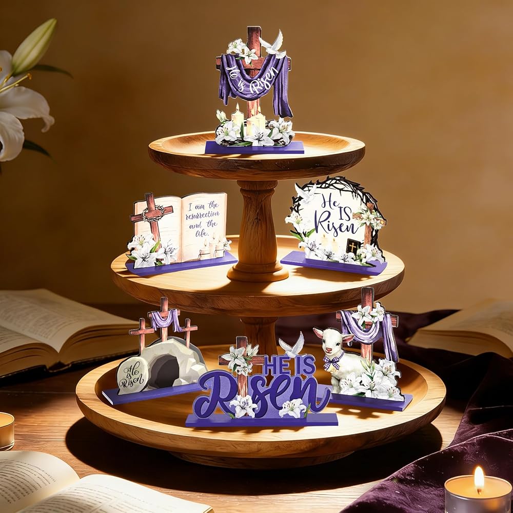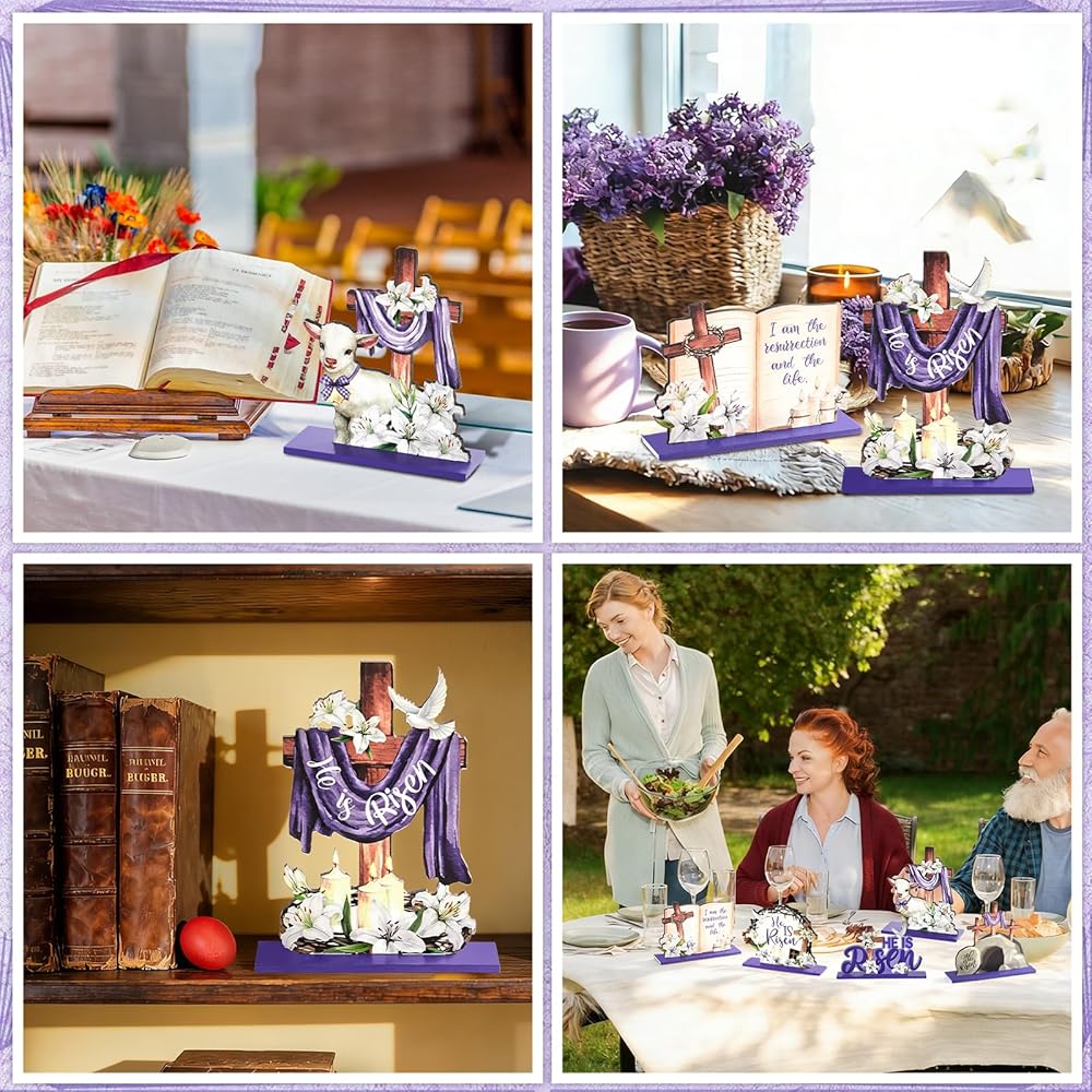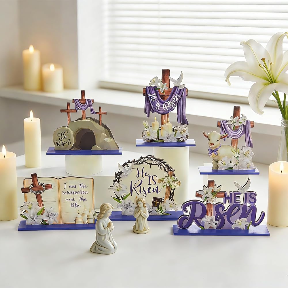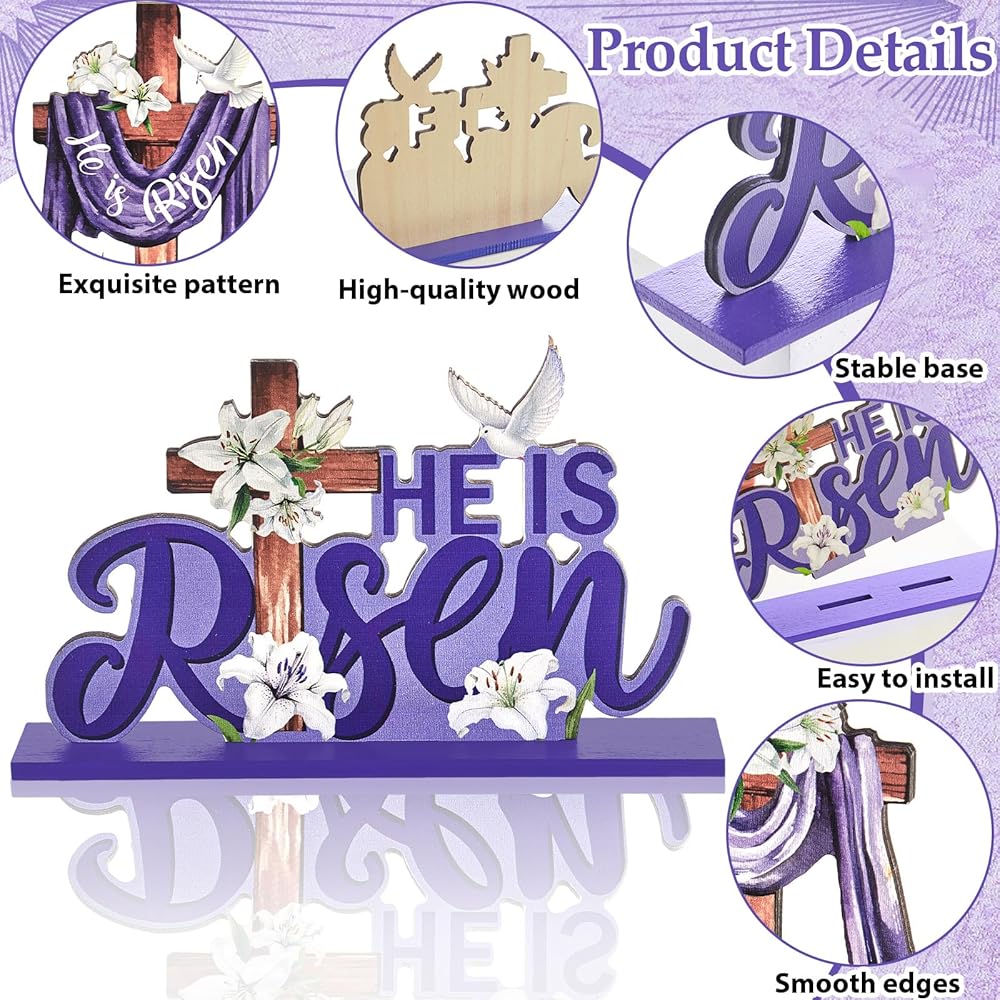 Wide application: This religious he is risen cross wood sign set is highly versatile. Whether placed on desks, bookshelves, windowsills, or tiered trays, they add a faithful touch to your home, kitchen, office, or parties, bringing unique charm to every corner.