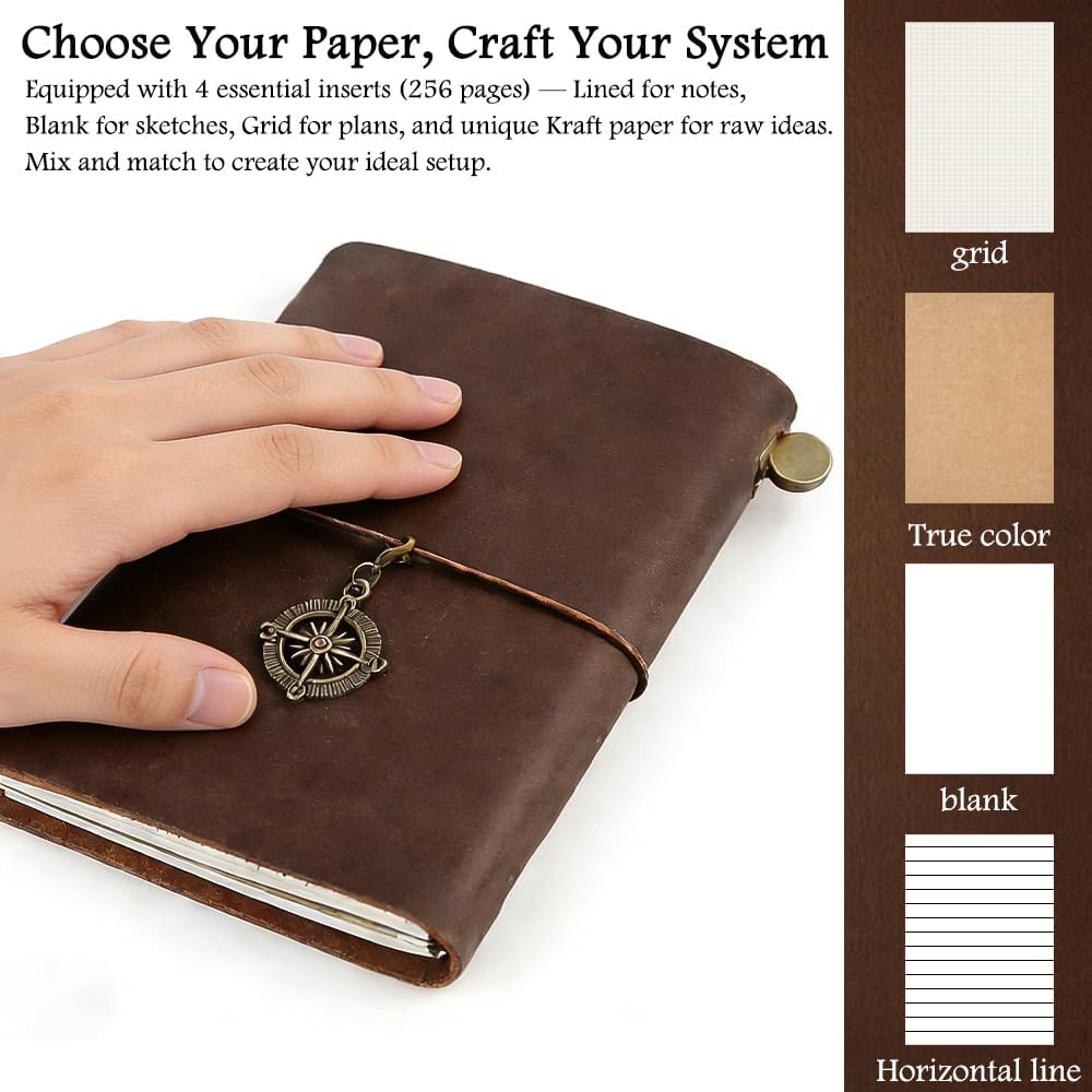 【A Complete Refillable Notebook System】 The ] set includes 4 premium inserts (240 pages) & accessories for a true travelers notebook experience. All inserts and elastics are replaceable, fulfilling the promise of a lasting leather refillable journal.