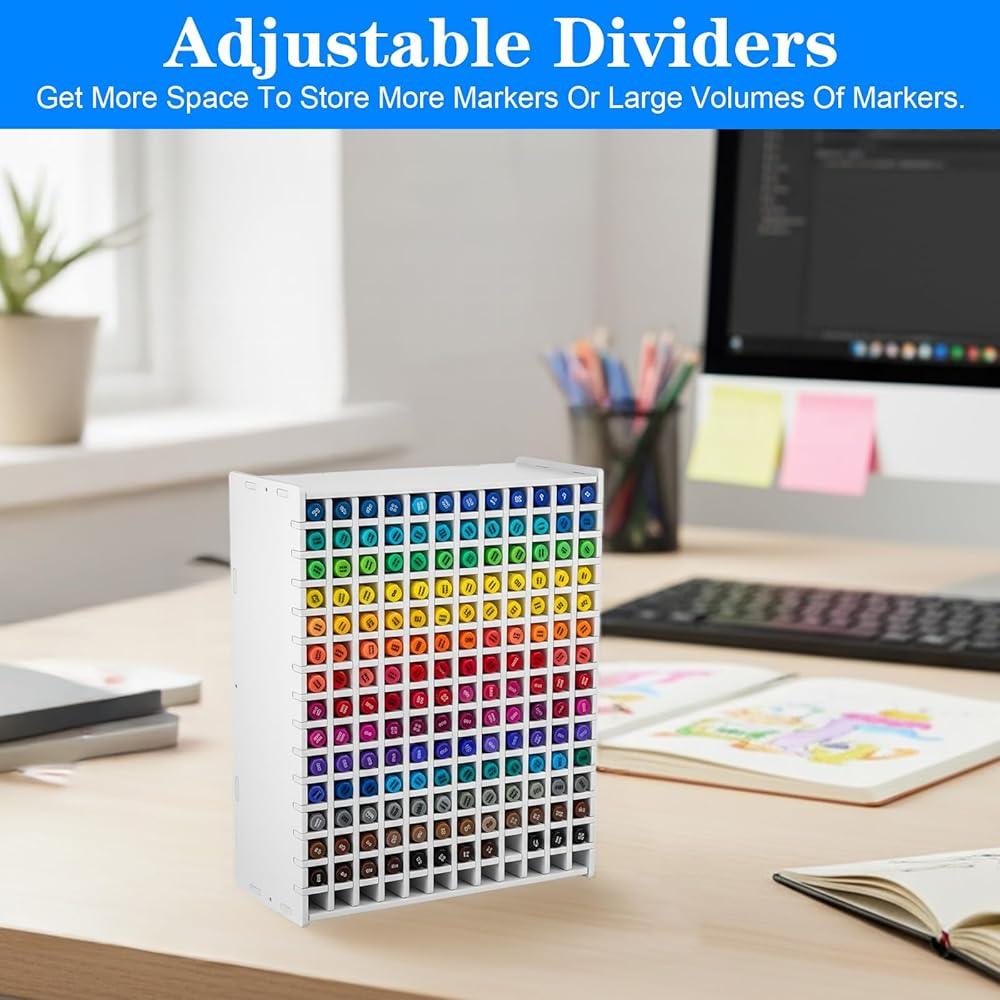 This marker organizer offers efficient storage for up to 180 markers, colored pencils, and art brushes. Its adjustable dividers allow customizable compartment sizes, while the durable PVC construction ensures long-lasting use. The space-saving design fits perfectly on desks or in cabinets, keeping your workspace tidy and your supplies easily accessible. Ideal for artists, students, and professionals seeking an organized creative environment.