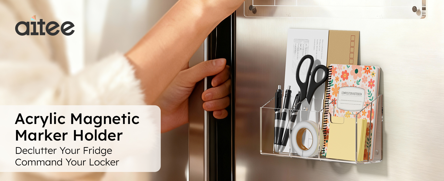 AITEE Large Magnetic Acrylic Fridge Organizer with 4 Strong Magnets - Command Center for Mail, Bills, Pens & Scissors, Multi-Compartment Holder for Refrigerator & Home Office (Large Size)