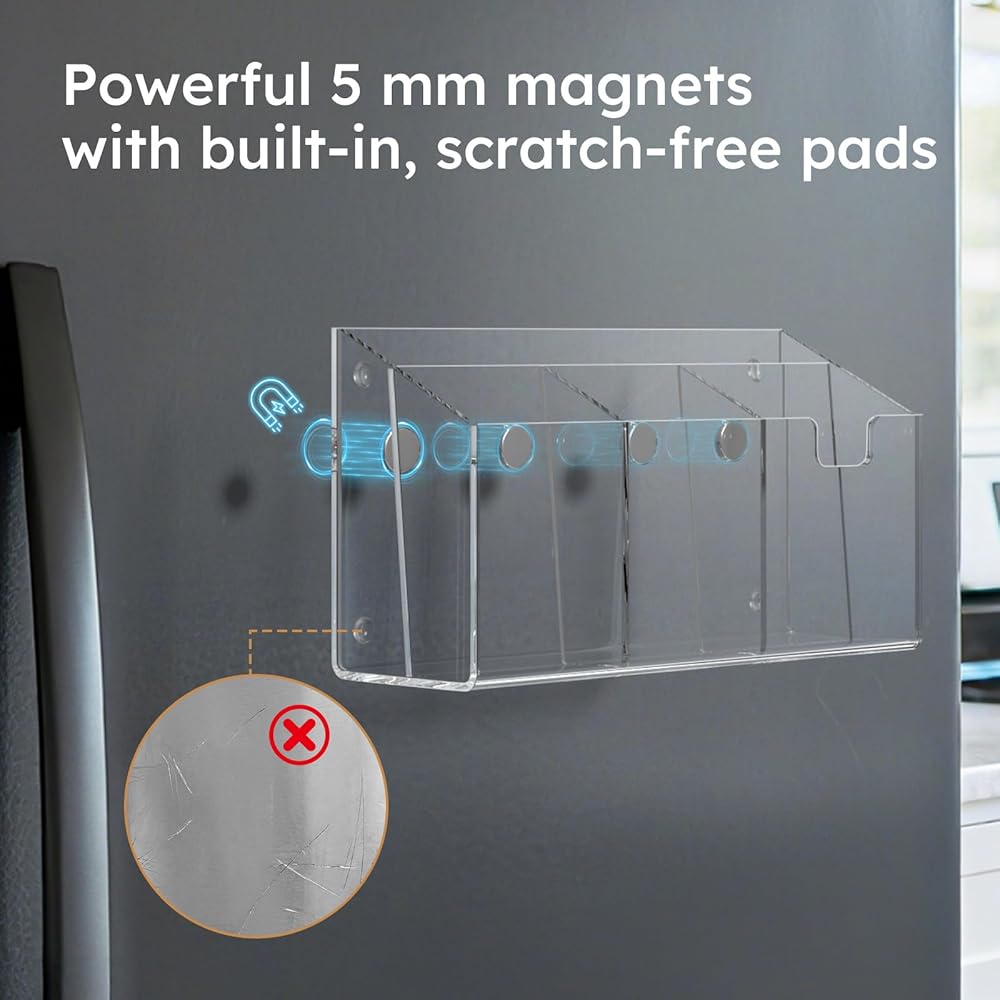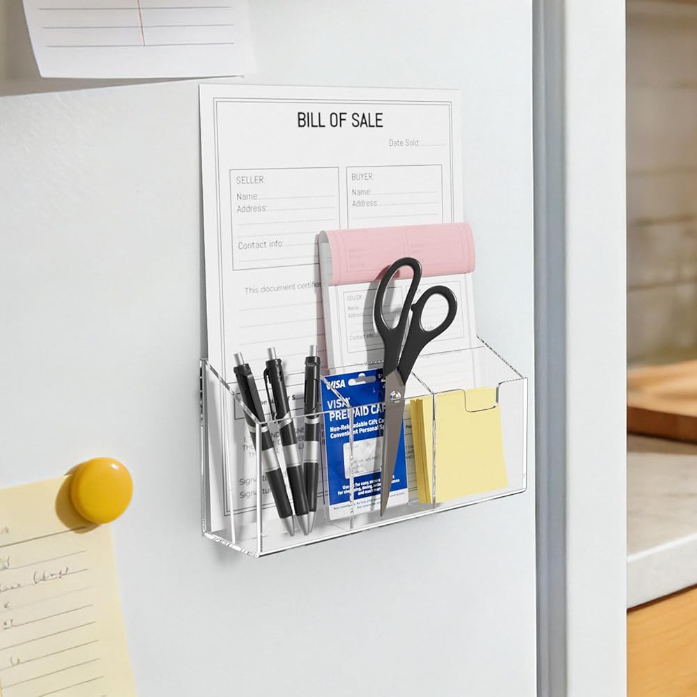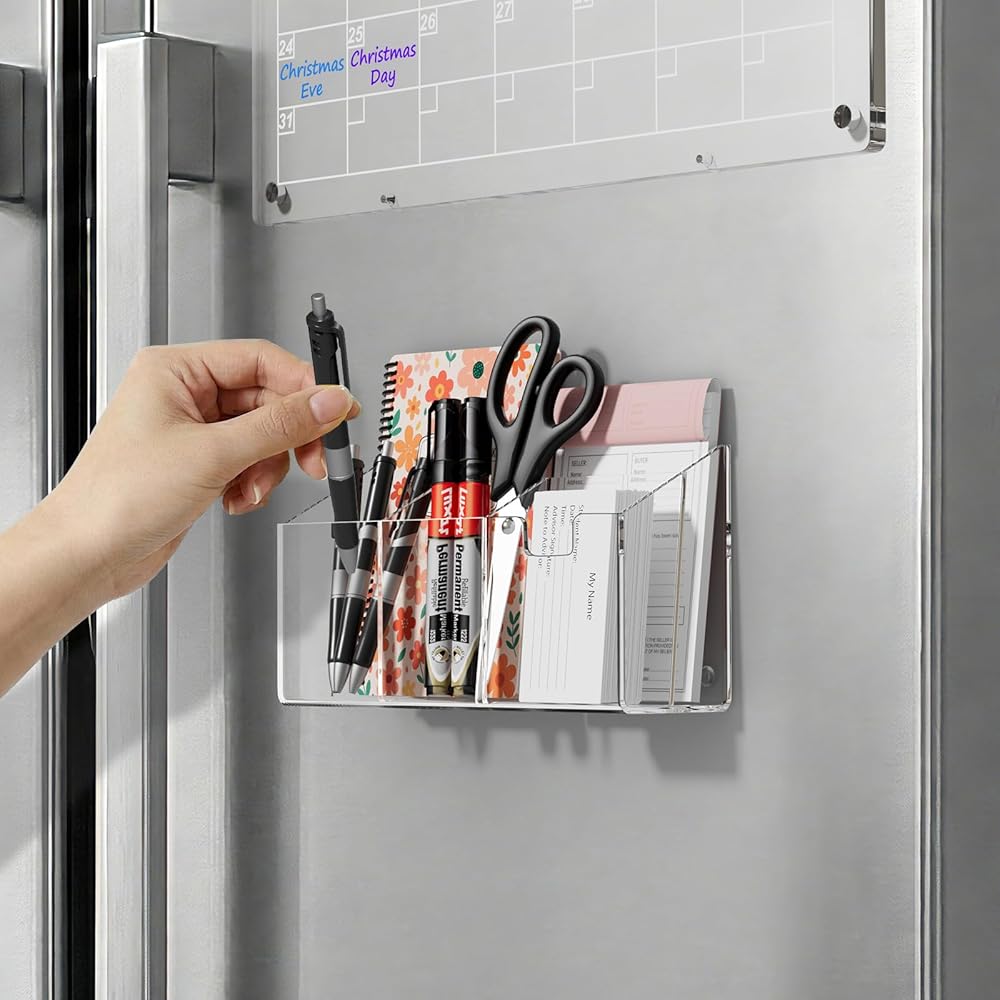 【Your Fridge Command Center】Say goodbye to kitchen counter clutter! This large magnetic acrylic organizer transforms your refrigerator into an efficient Family Command Center. Specially designed wider compartments securely hold not just pens and scissors, but also your daily mail, bills, and letters, keeping everything visible and within reach for busy families.