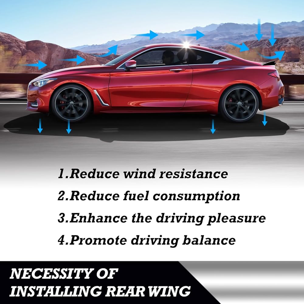 FUNCTION:①When the car is driving at high speed, the air resistance forms a downward pressure, which can offset the lift as much as possible, effectively control the downward pressure of the airflow, reduce the drag coefficient accordingly, and increase the high-speed driving stability of the car ②Since the tail wing can reduce the air resistance of the car, the installation of a tail wing on a high-speed car can also help save fuel ③At the same time, it also makes the appearance of the car more beautiful and plays a certain decorative role