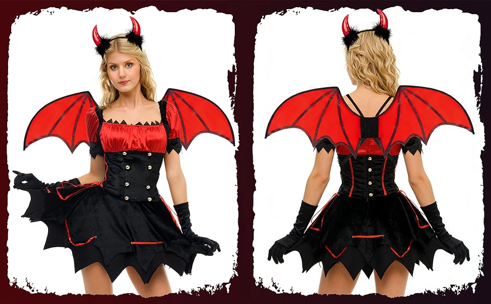 【High Quality Material】The devil costume set is made of high-quality polyester and plastic accessories,featuring excellent craftsmanship and strong stitching that resists damage.It can be reused multiple times.
