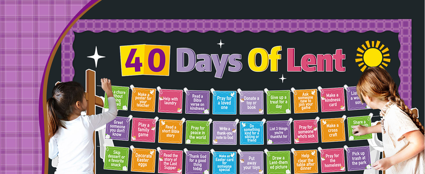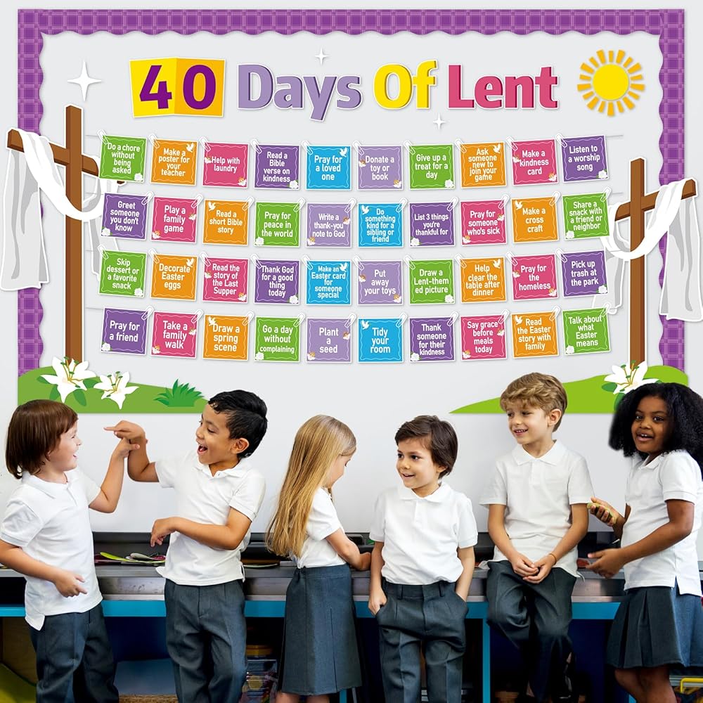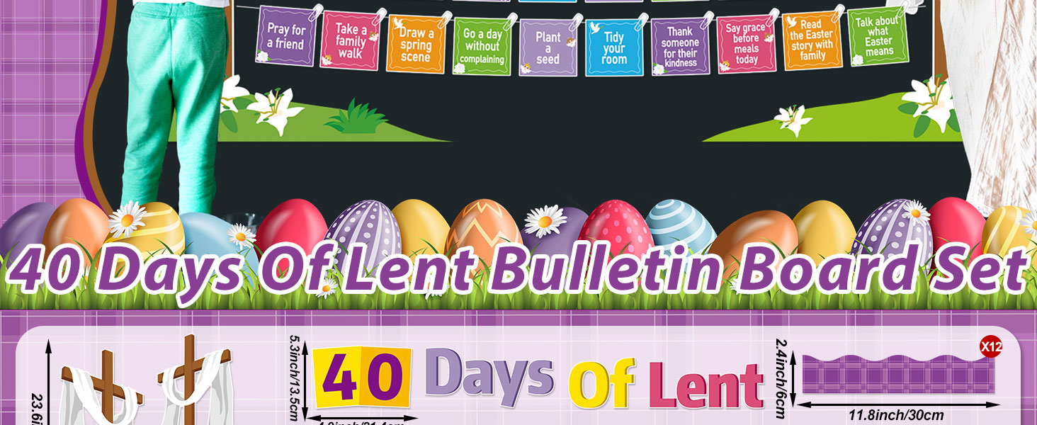 Lent-Themed Design: Centered on the "40 Days Of Lent"theme, these Christian religious classroom decorations feature Jesus cross cutouts, Lent-themed charts, and seasonal accents. The bold, vivid design (paired with featuring cross motifs and Lent-themed copy) inspires reflection, great for Sunday school or church spaces.