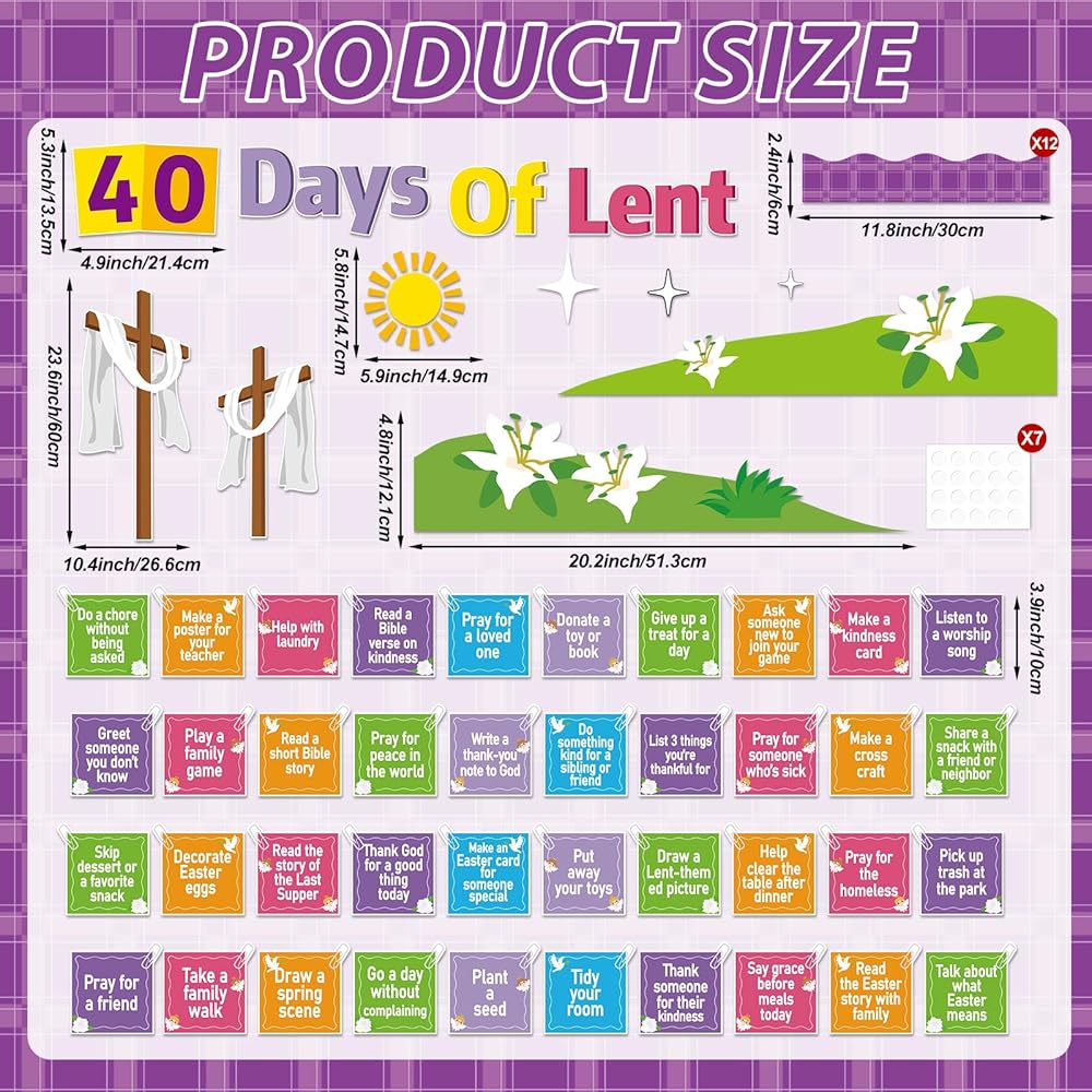 Easy to Use: With pre-cut pieces and included adhesive dots, setup is simple—arrange the purple borders, Lent 40 days activity chart cutouts, and chart elements on bulletin boards, walls, or doors. No extra tools are needed to create a meaningful, eye-catching Lent display.