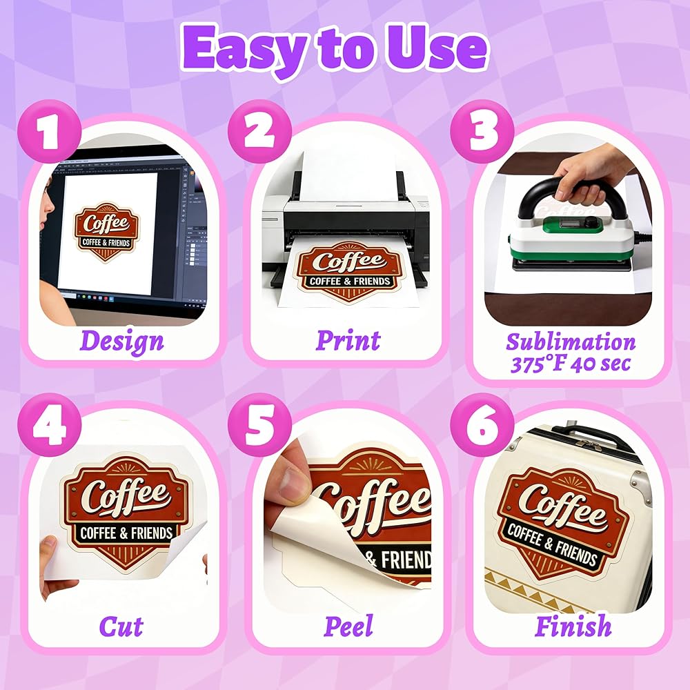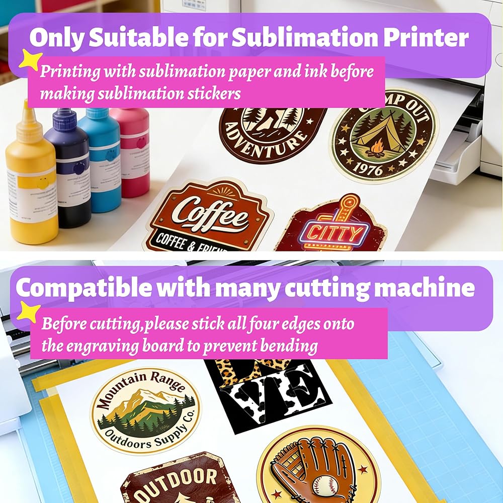 Sublimation Printer + Ink Required: Print your mirrored design on sublimation paper first, then heat press it onto the sublimation sticker paper sheet.Preheat your press for 5 minutes. Press at 375°F to 400°F for 40 to 60 seconds with light, even pressure, then adjust as needed.