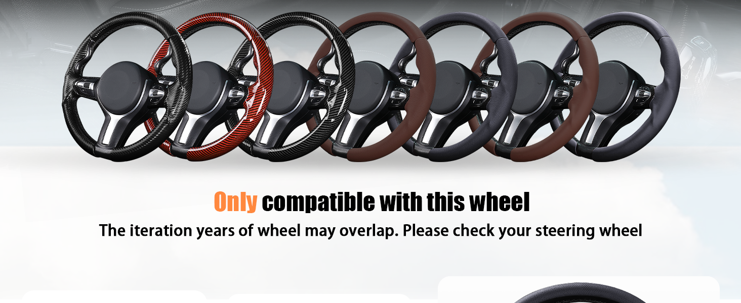 Compatibility: steering wheel cover for BMW 2 Series F22 F23 F45 F46 2014-2019 / 3 Series F30 F31 F34 F35 2012-2019 / 4 Series F32 F33 F36 2014-2019 / 5 Series F07 F10 F11 F18 2014-2016 / 6 Series 2014-2018 / M2 F87 2016-2019 / M3 2015-2018 / M4 2015-2019 / M5 2014-2016 / M6 2012-2019 / X3 F25 2014-2017 / X4 F26 2015-2018 / X5 F15 2014-2018 / X5 M F85 2014-2018 / X6 2015-2019.(Note: Only compatible with specific wheel shown in the picture. Please check if your steering wheel is compatible.)