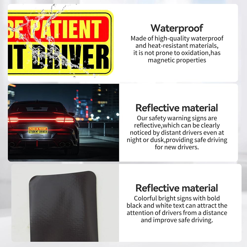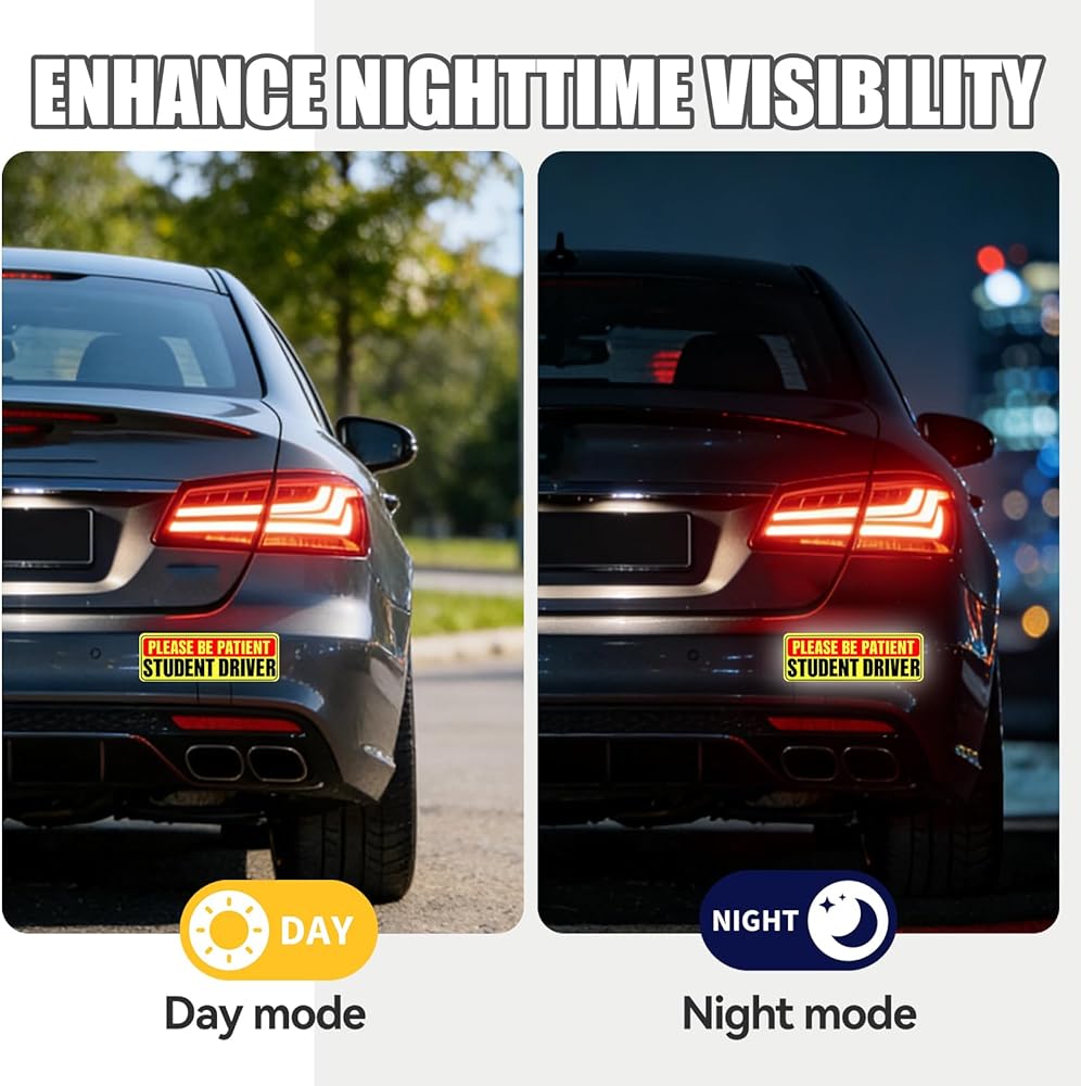 Reflective for Day and Night Safety: Built with reflective material, the rookie driver magnets maintain excellent visibility even during dusk, nighttime, or in low-light weather. They alert nearby drivers to your new driver status, giving them time to slow down, maintain distance, and approach your vehicle with greater caution